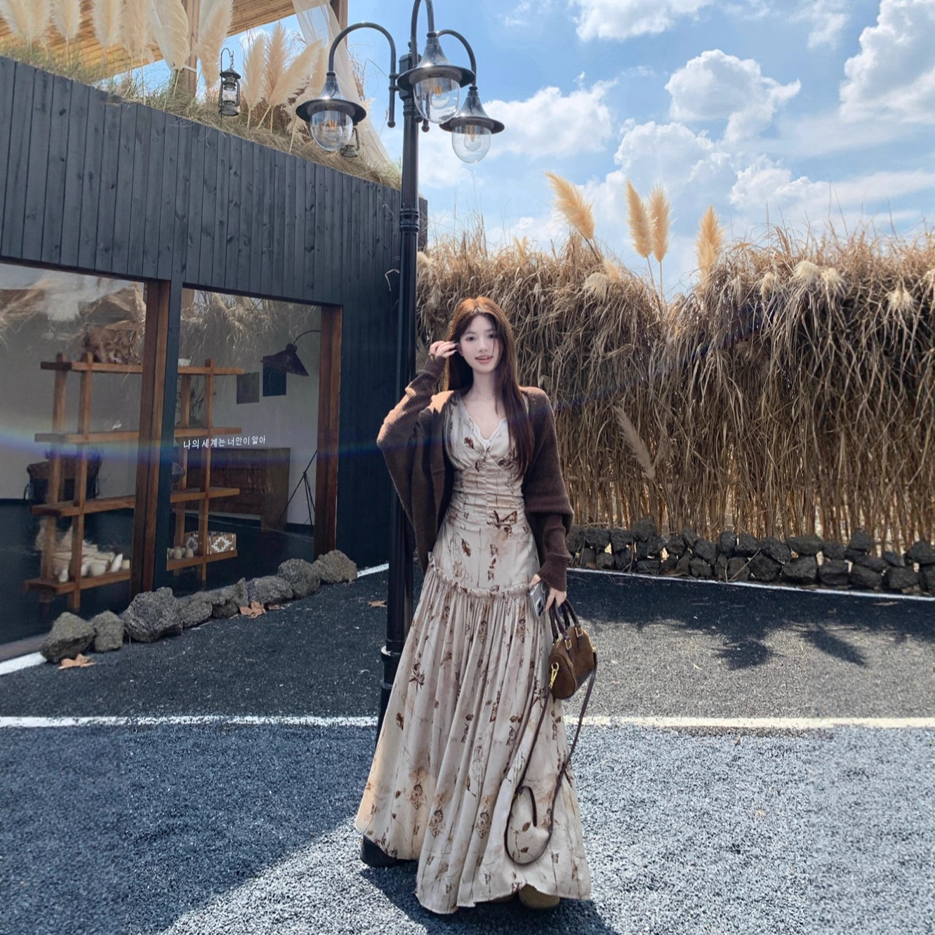 法式V领蝴蝶印花连衣裙温柔风套装女秋季针织毛衣开衫外套两件套