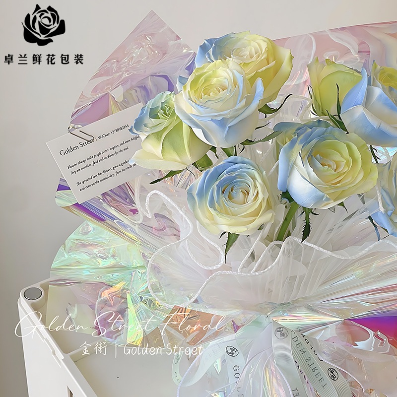 七夕節用カラフルフィルムフラワーラッピングペーパー、レーザーレインボー透明厚手防水ガラス紙ギフトブーケ素材