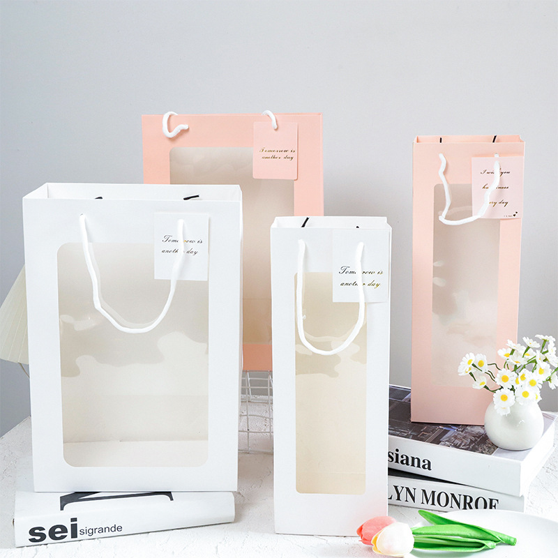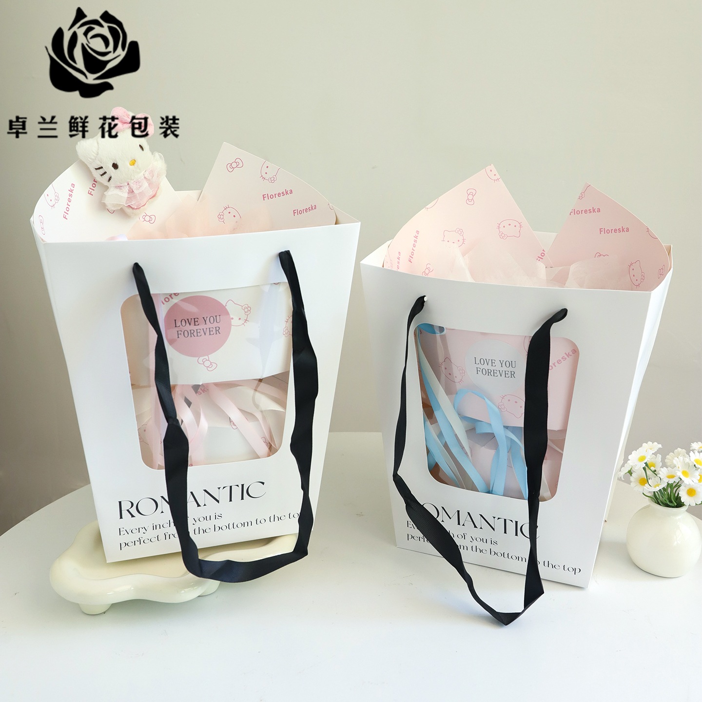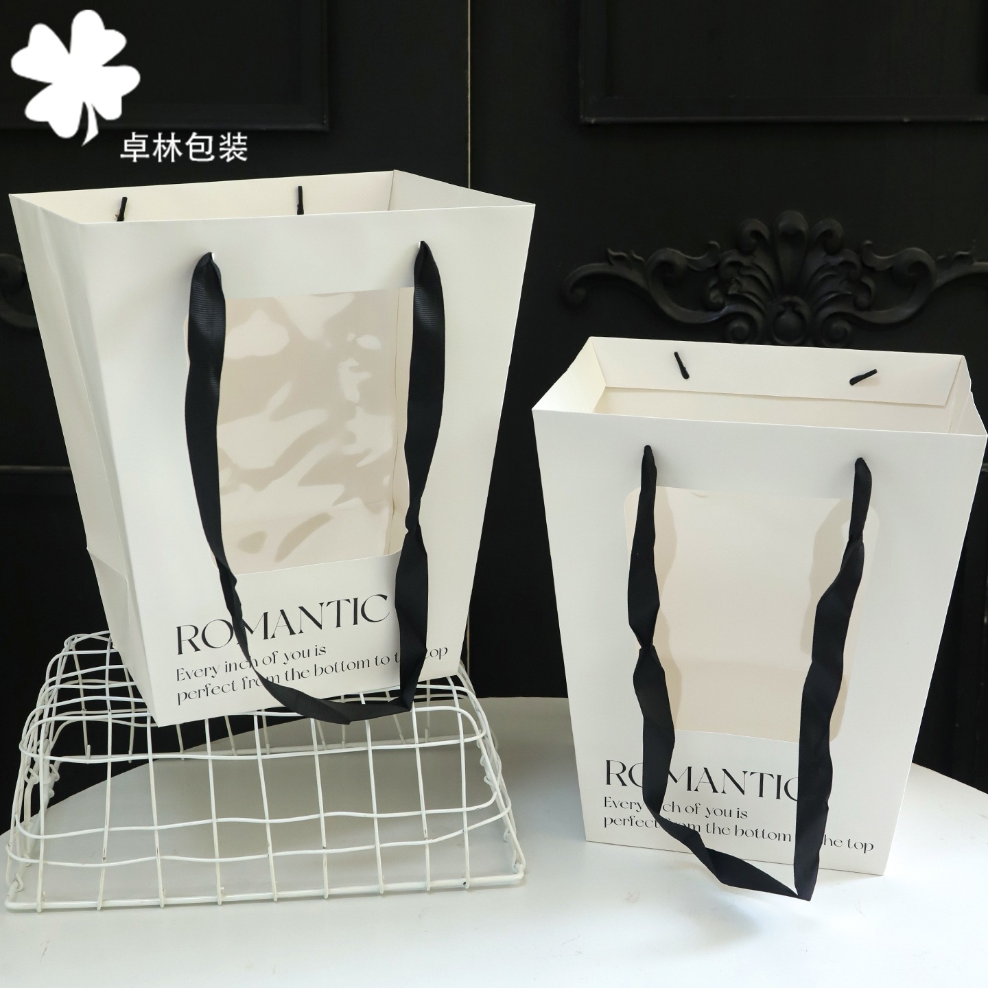 卓林鲜花手提袋T型开窗手拎袋简约ins白卡纸袋花店花束打包材料