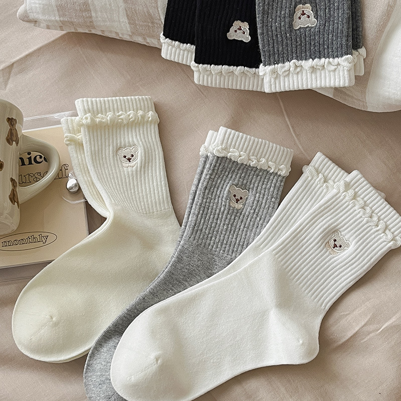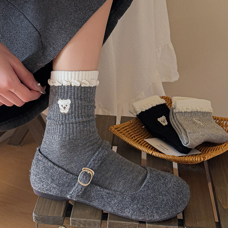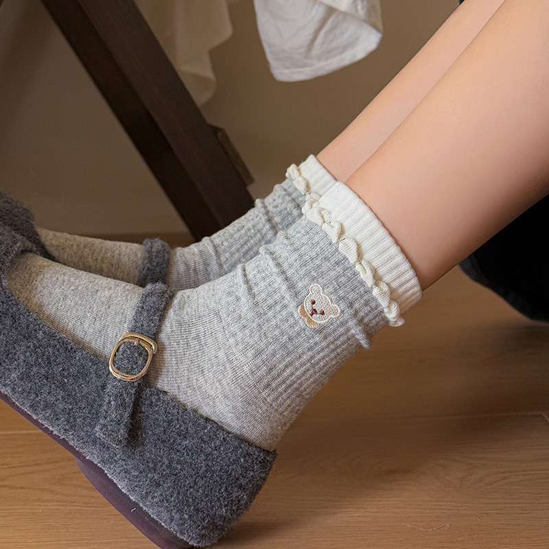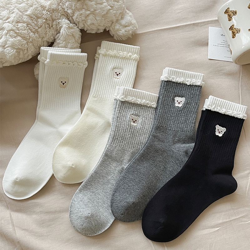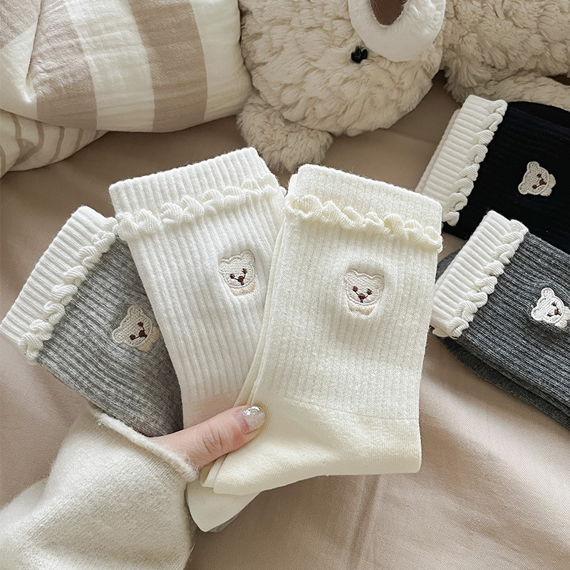 秋冬新款中筒袜吸汗透气可爱刺绣无骨棉袜韩系卡通堆堆袜子批发