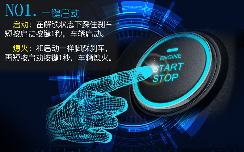 1. 脚踩刹车短按可以一键启动/熄火汽车,长按最长5秒启动,松手即停。