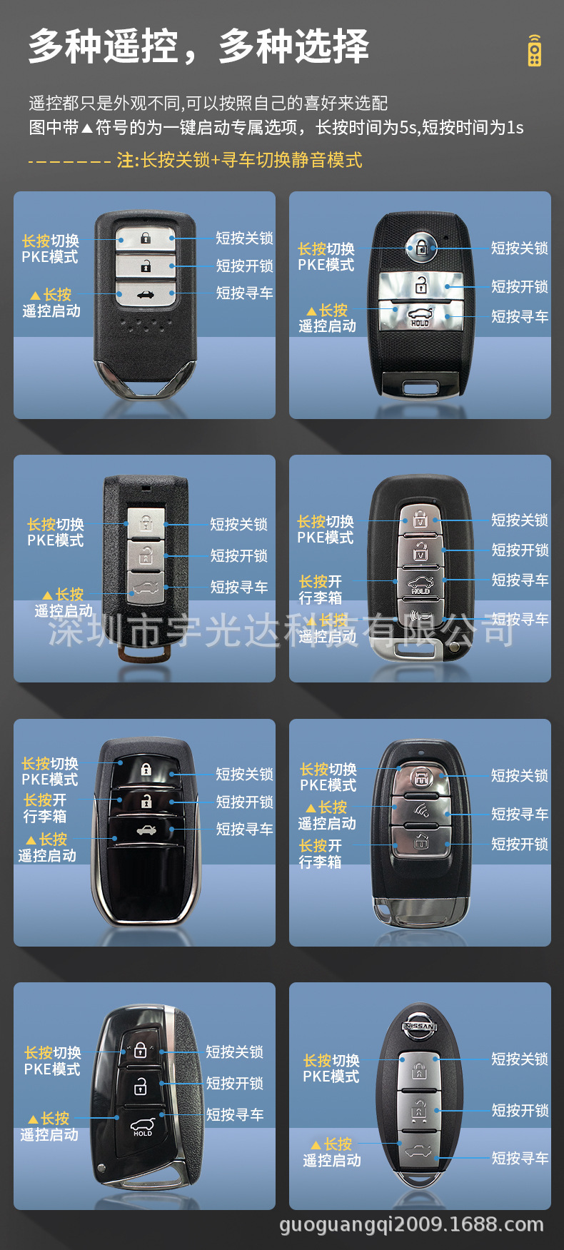 17.遥控器按钮支持静音模式切换,PKE模式打开或是关闭等功能。