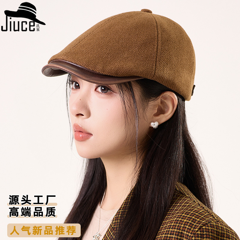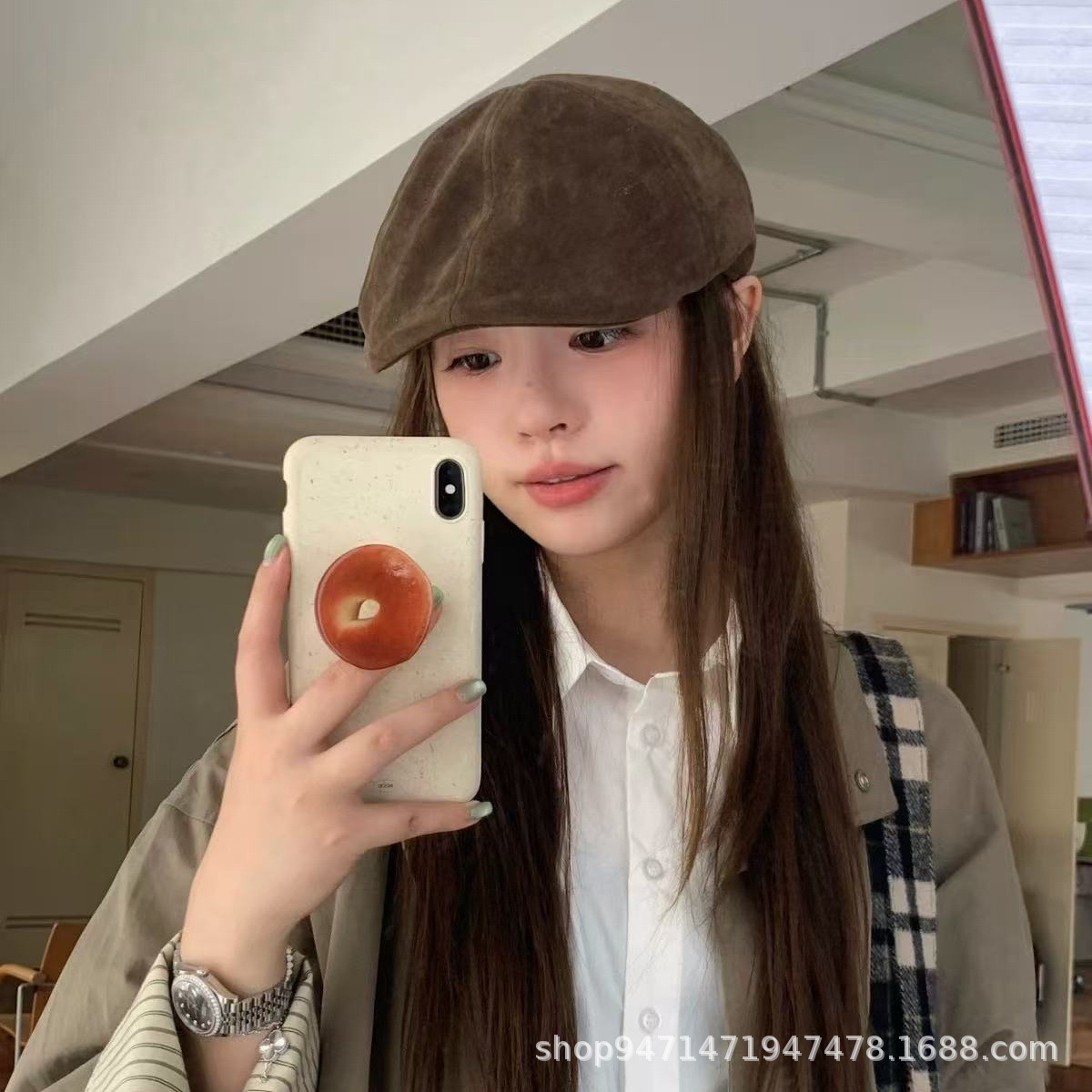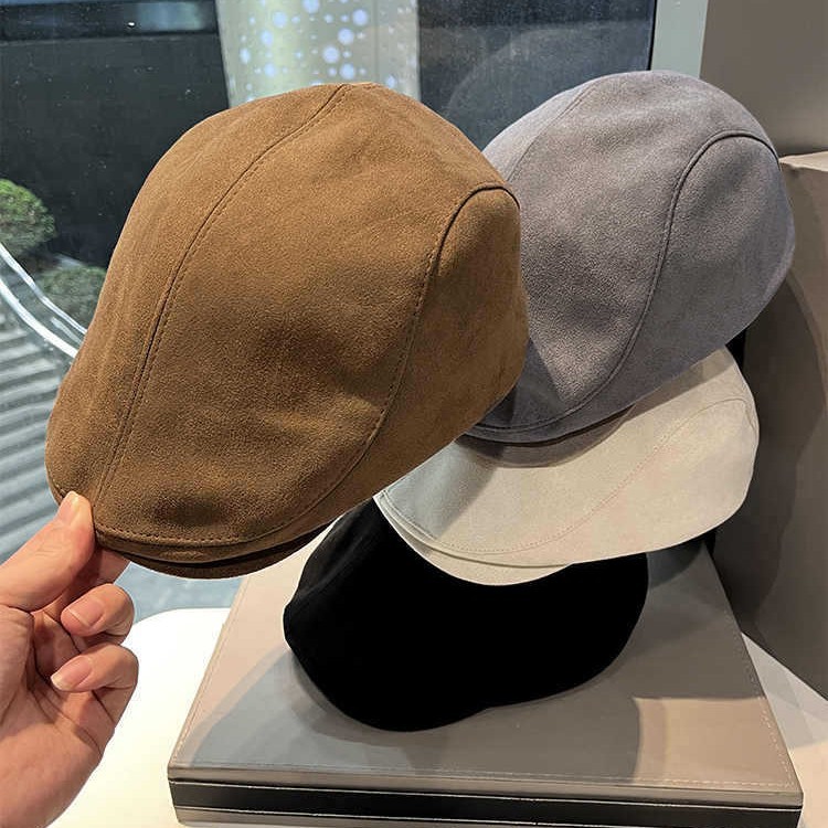 韩版麂皮绒质感反带前进帽女2025秋冬新款贝雷帽复古英伦风报童帽