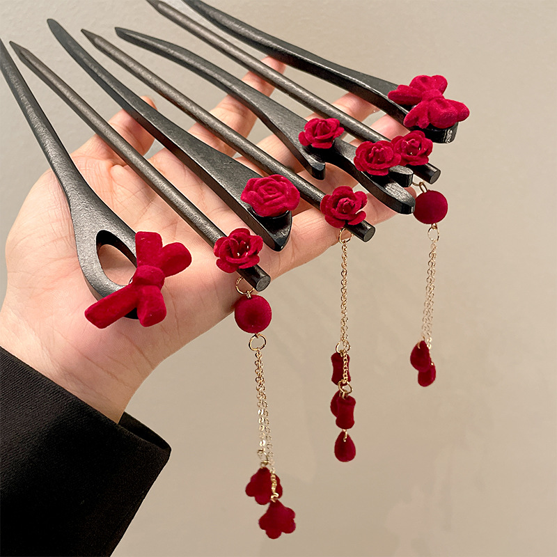 赤いツバキの花のフリンジ新年のヘアピンの女性の高級感の後頭部のヘアピンの古風な漢服のチャイナドレスのヘアピン