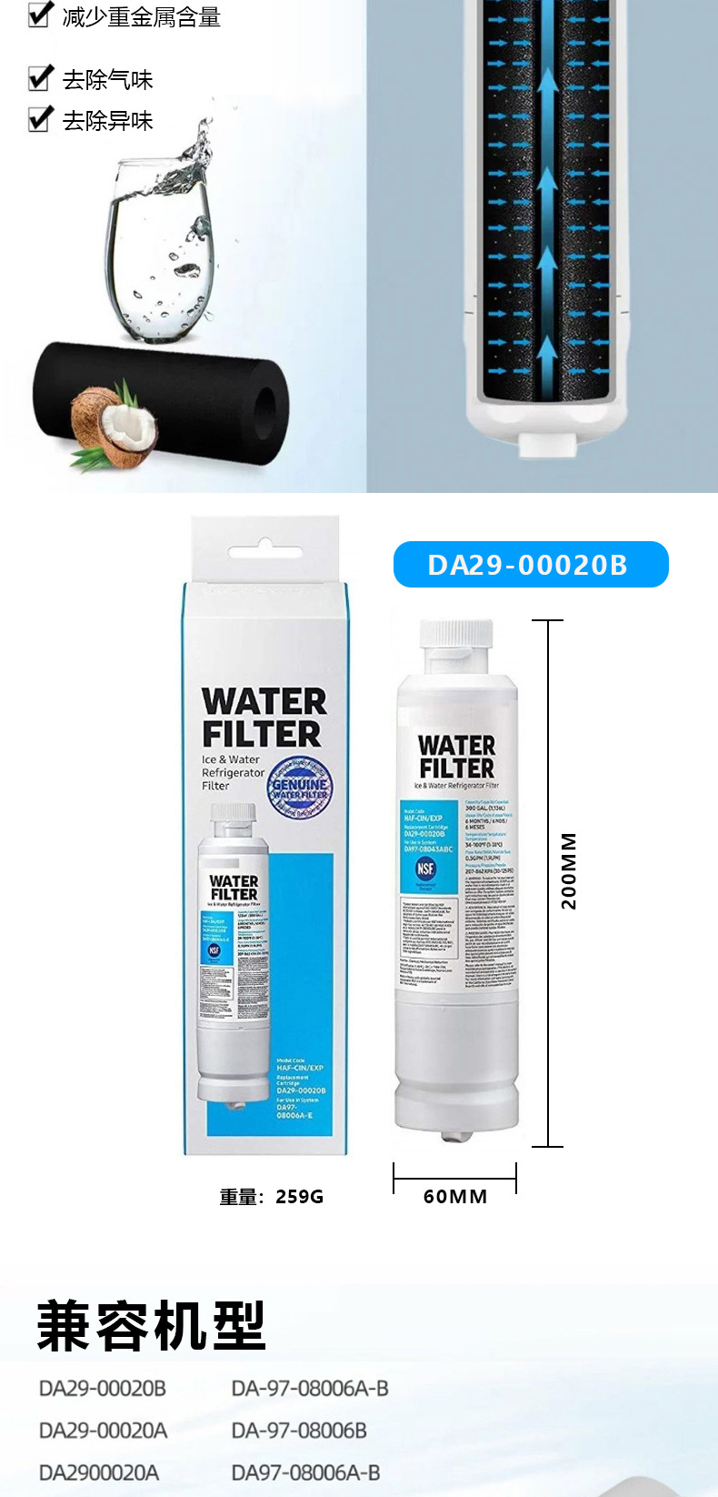 DA29-10105J冷蔵庫フィルターエレメント、汎用ヤシ殻活性炭棒冷蔵庫フィルターエレメント外付け筒型浄水器