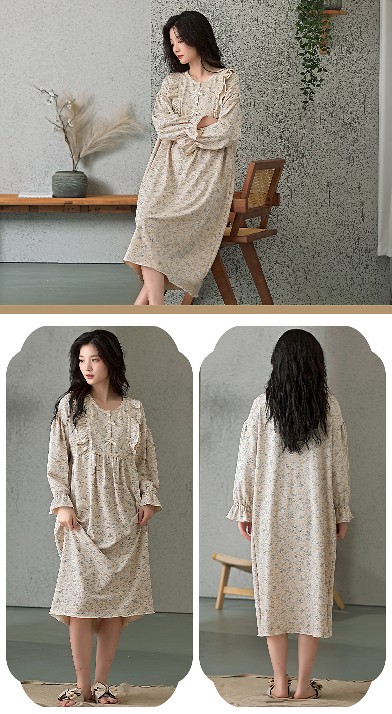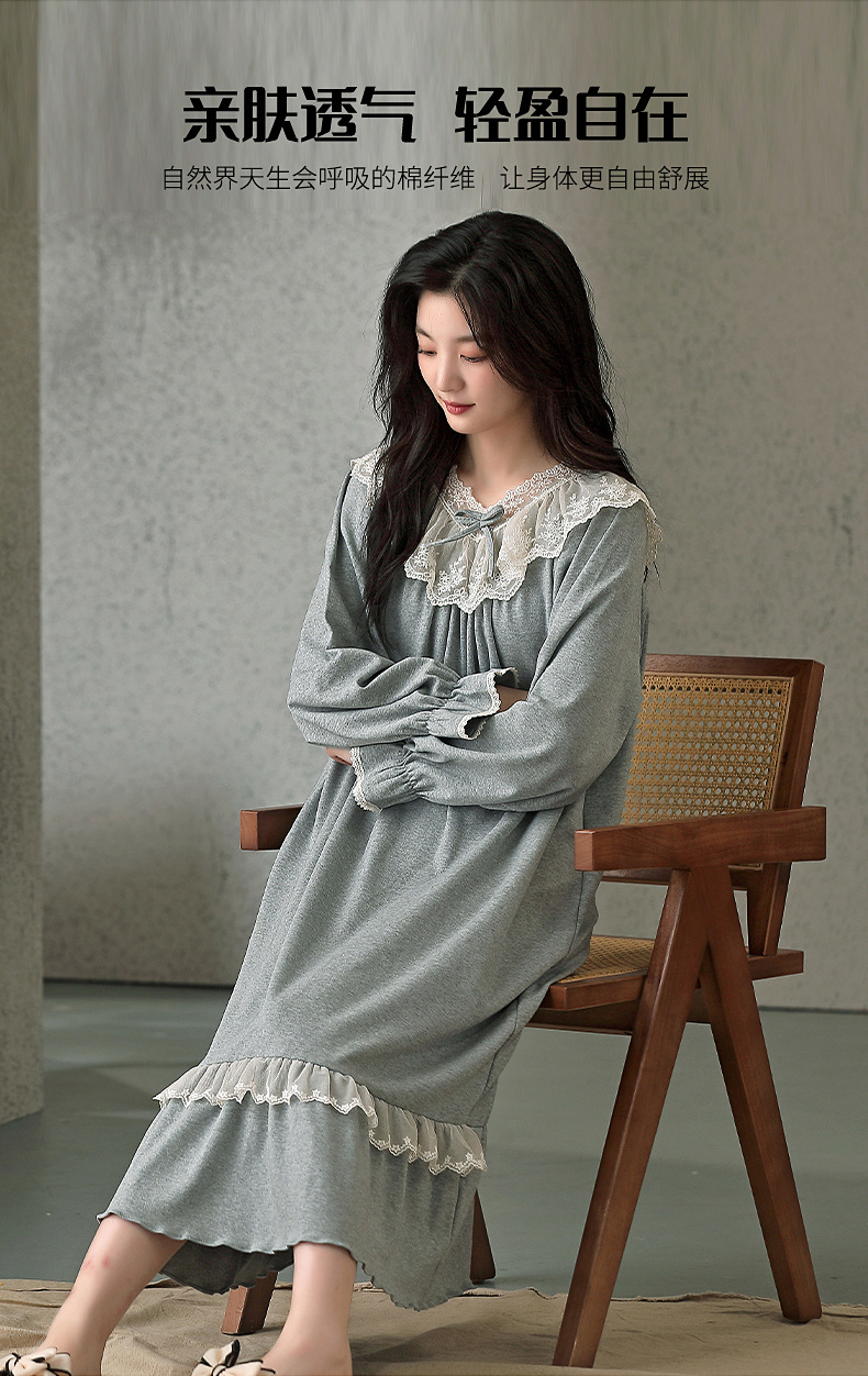 2025秋冬新款100纯棉女士睡裙中长款开衫舒适透气睡衣春秋家居服