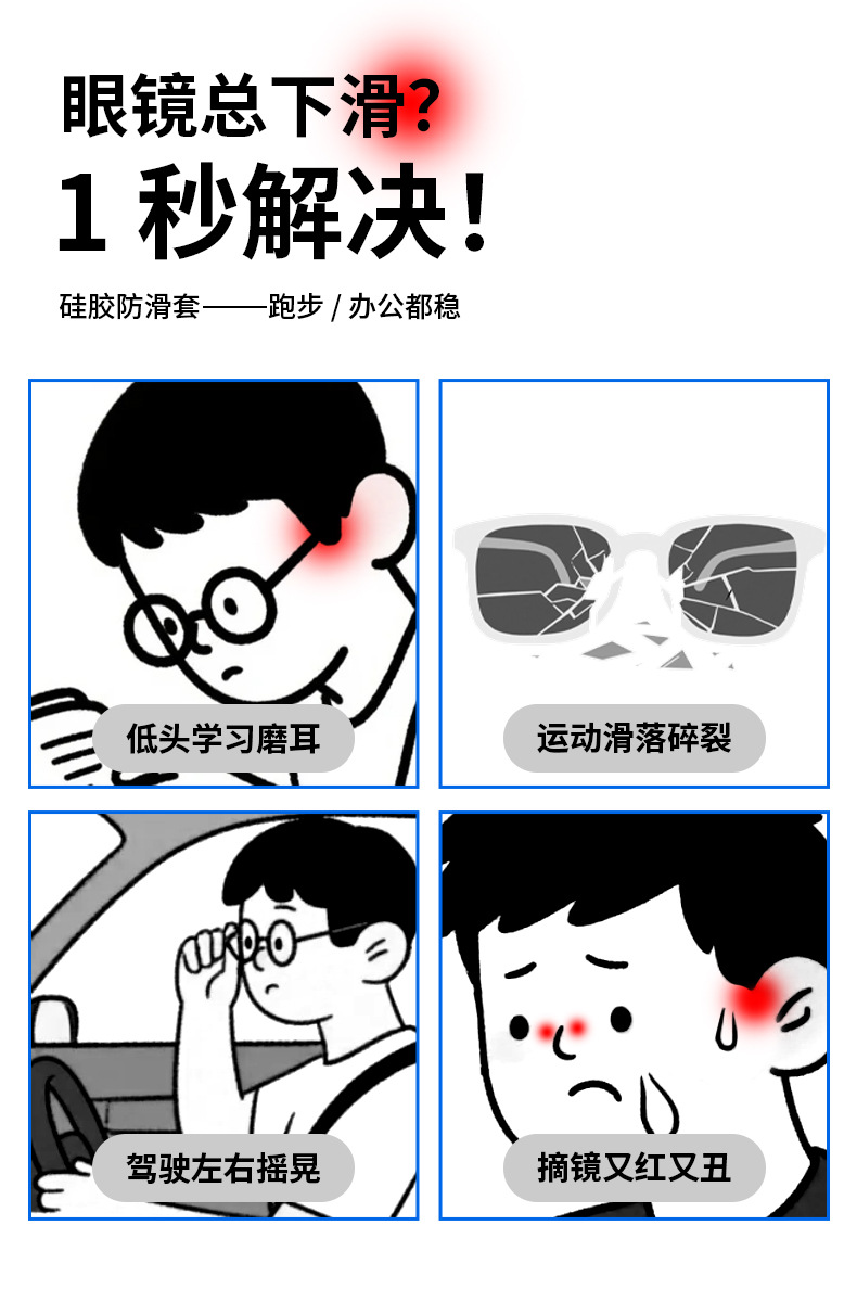 メガネ滑り止めカバー、シリコン滑り止め脚カバー、落下防止加工品、メガネフレーム固定、耳後ろ耳サポート、落下防止固定具
