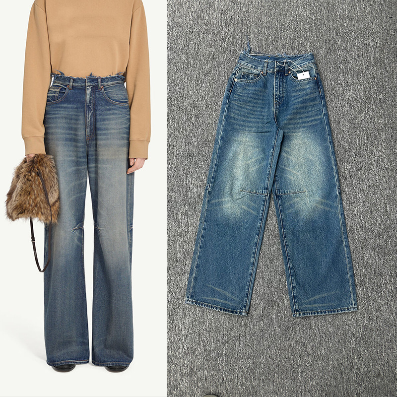 MM6高腰直筒牛仔裤女欧美风百搭宽松拼接毛边阔腿长裤女2025新款