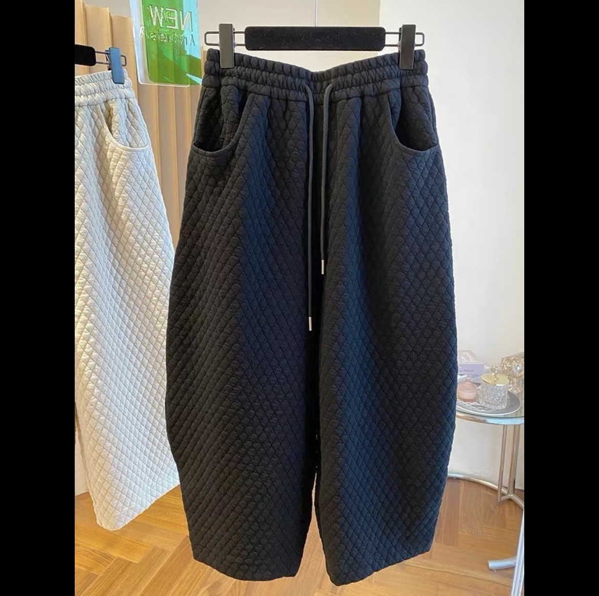 特大码300斤复古日系菱格夹棉九分休闲裤女哈伦裤显瘦宽松秋冬款