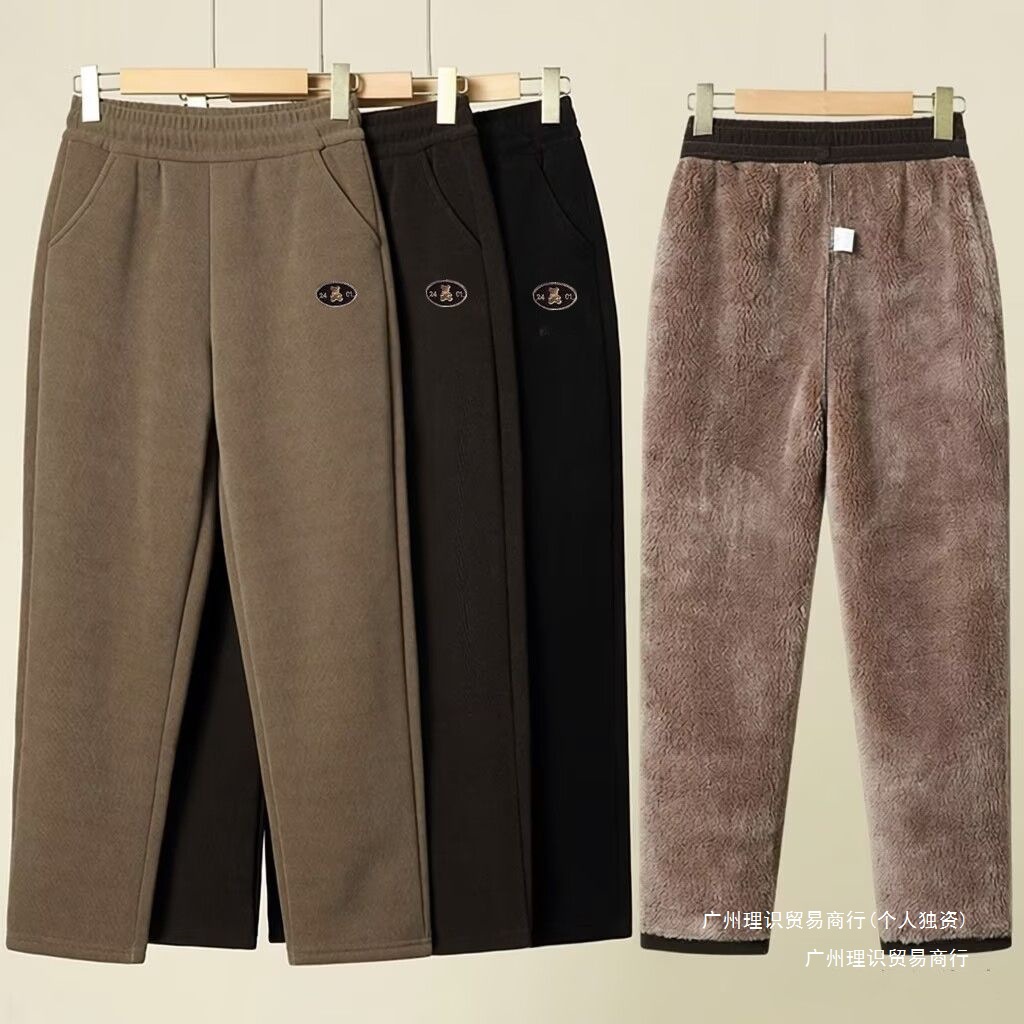 秋冬新作特厚裏起毛ハイウエストカジュアルママ用保温パンツ、外履き用ゴムウエストストレートパンツ