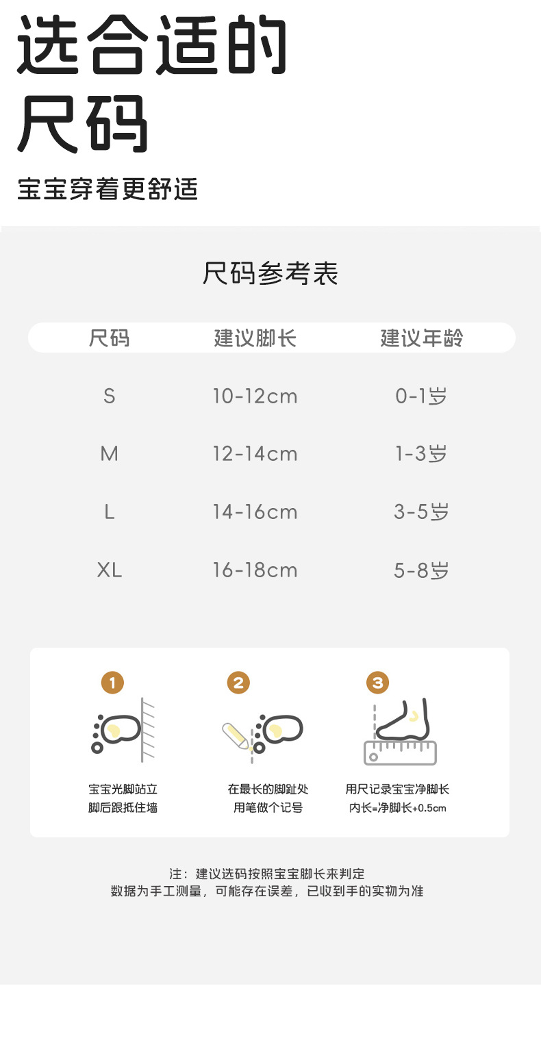 童袜尺码 S(建议0-12个月,建议脚长10-12cm),M(建议1-3岁,建议脚长12-14cm),L(建议3-5岁,建议脚长14-16cm)