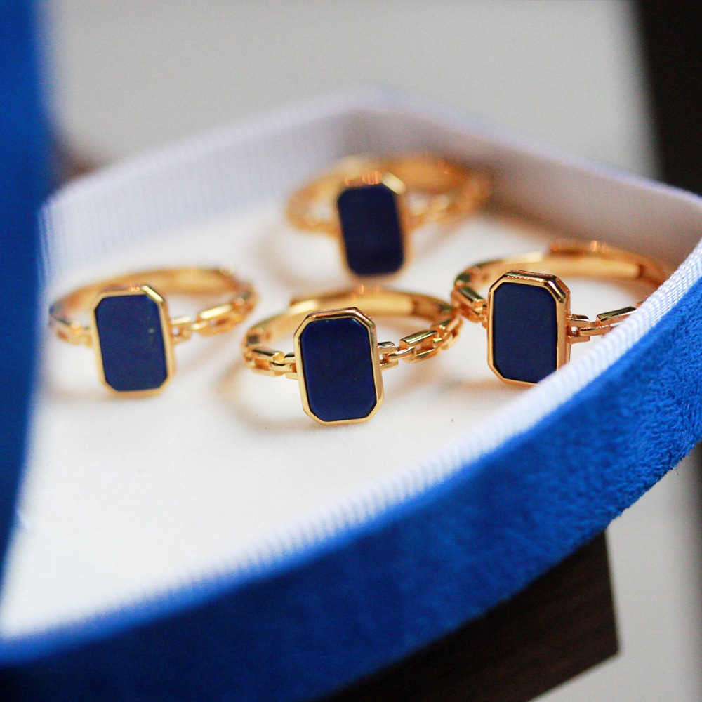 アフガニスタン産天然ラピスラズリの小さなスクエアリング s925 オールオーバースターリングシルバーゴールドメッキ象嵌ニッチレディースリング