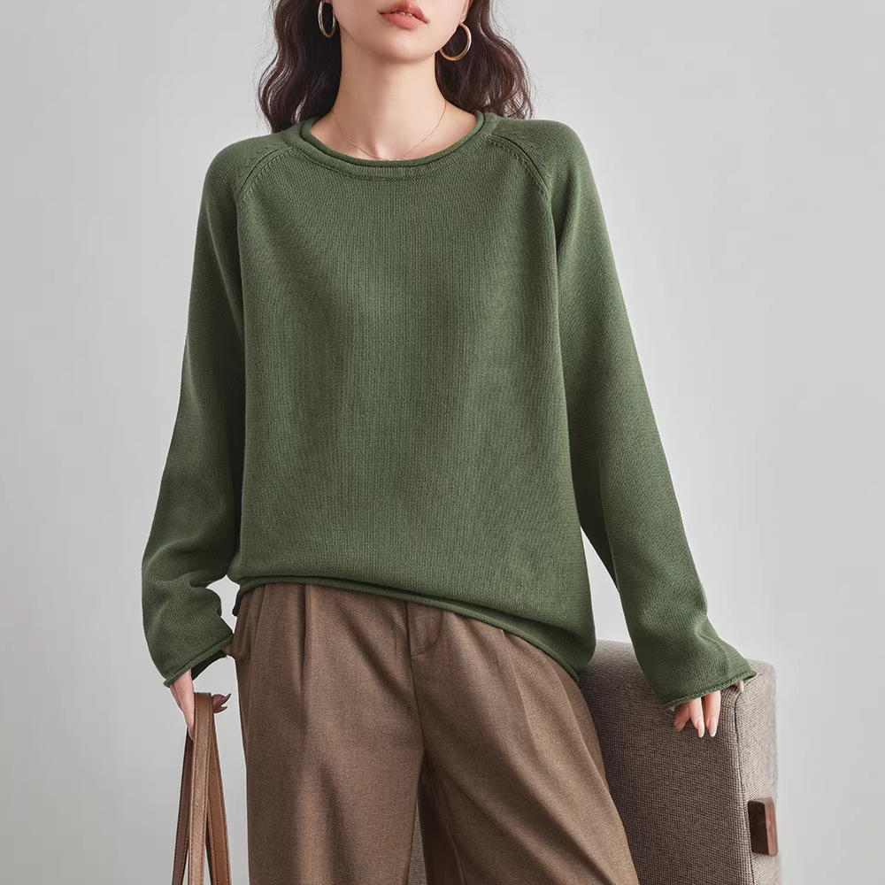 全棉线卷边圆领宽松毛衣女纯棉内搭针织衫秋冬长袖女装打底衫上衣