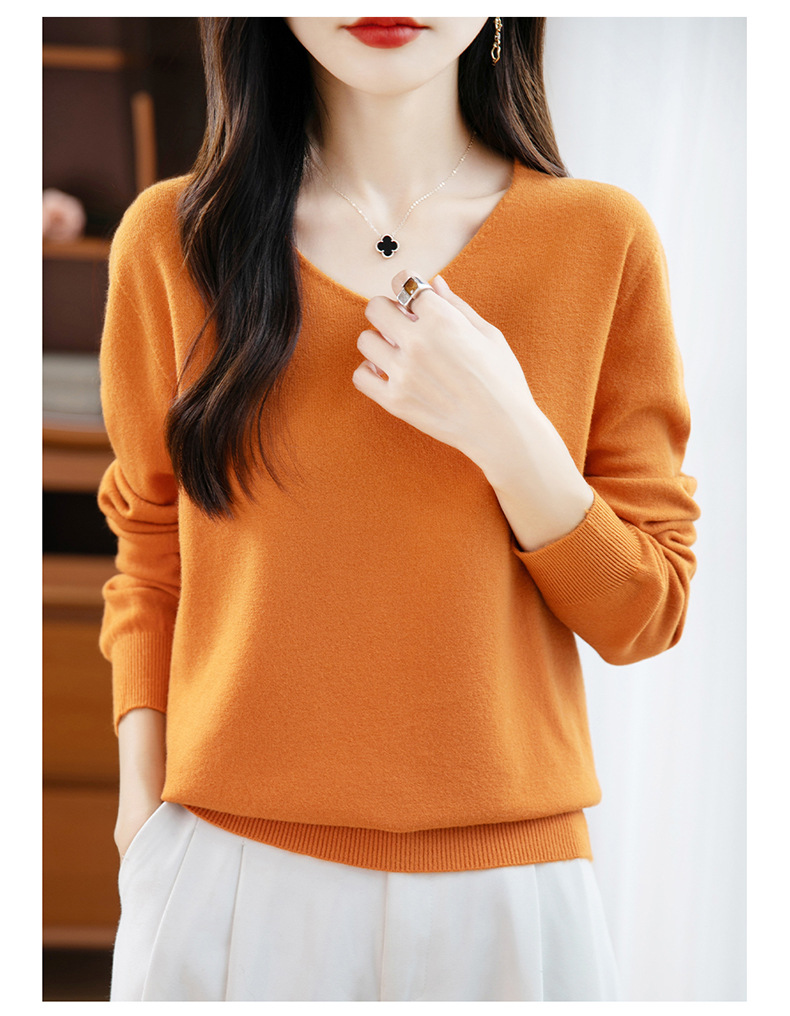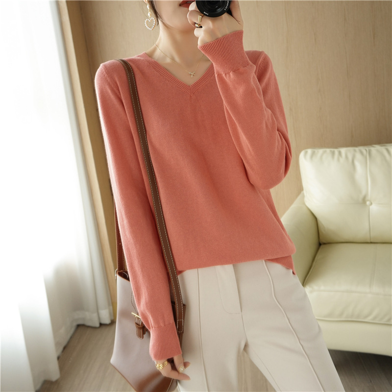 23秋冬の新型女性綿のプルオーバーの小さいvネックの基礎のセーターはゆったりとしていて、痩せています。