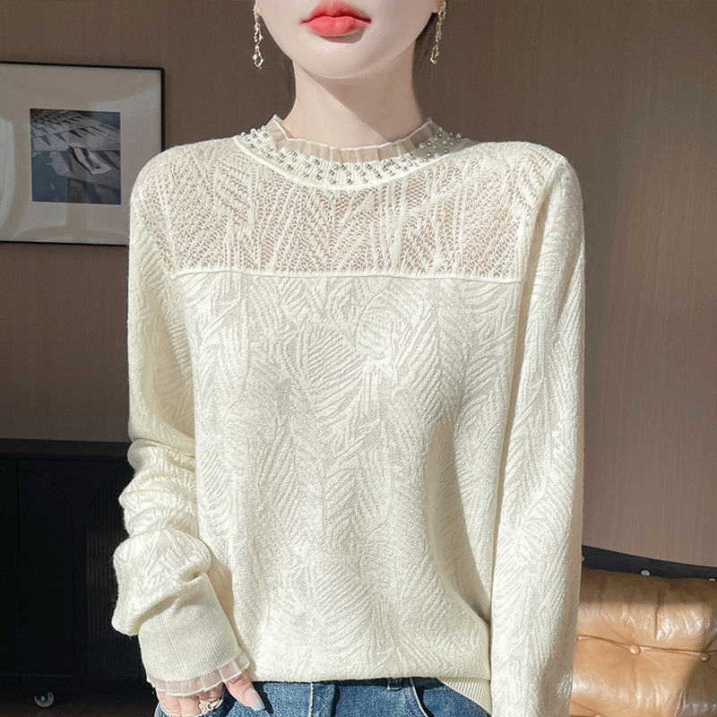 透かし彫りの花の縁の襟のカシミヤのシャツの女性のニットの底のシャツの頭の半分の高さの襟の100のセーターの女性はゆったりしていてやせています。