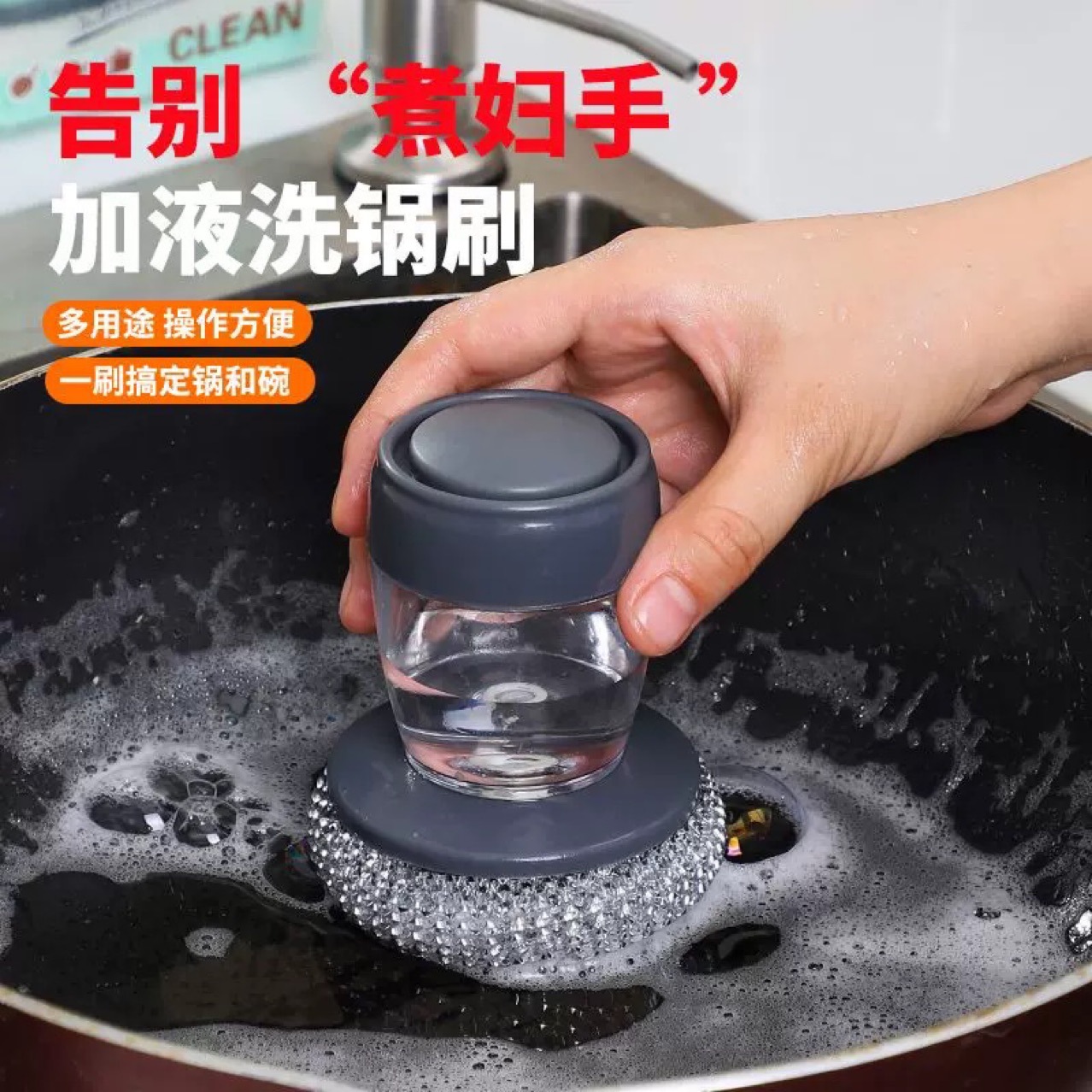 鍋洗い自動給液食器洗いブラシ キッチン家庭用鍋洗いブラシ 楽々押し式 鍋を傷めない洗浄ブラシ