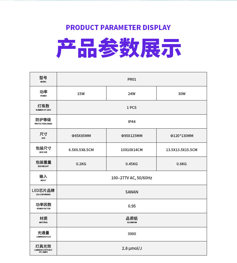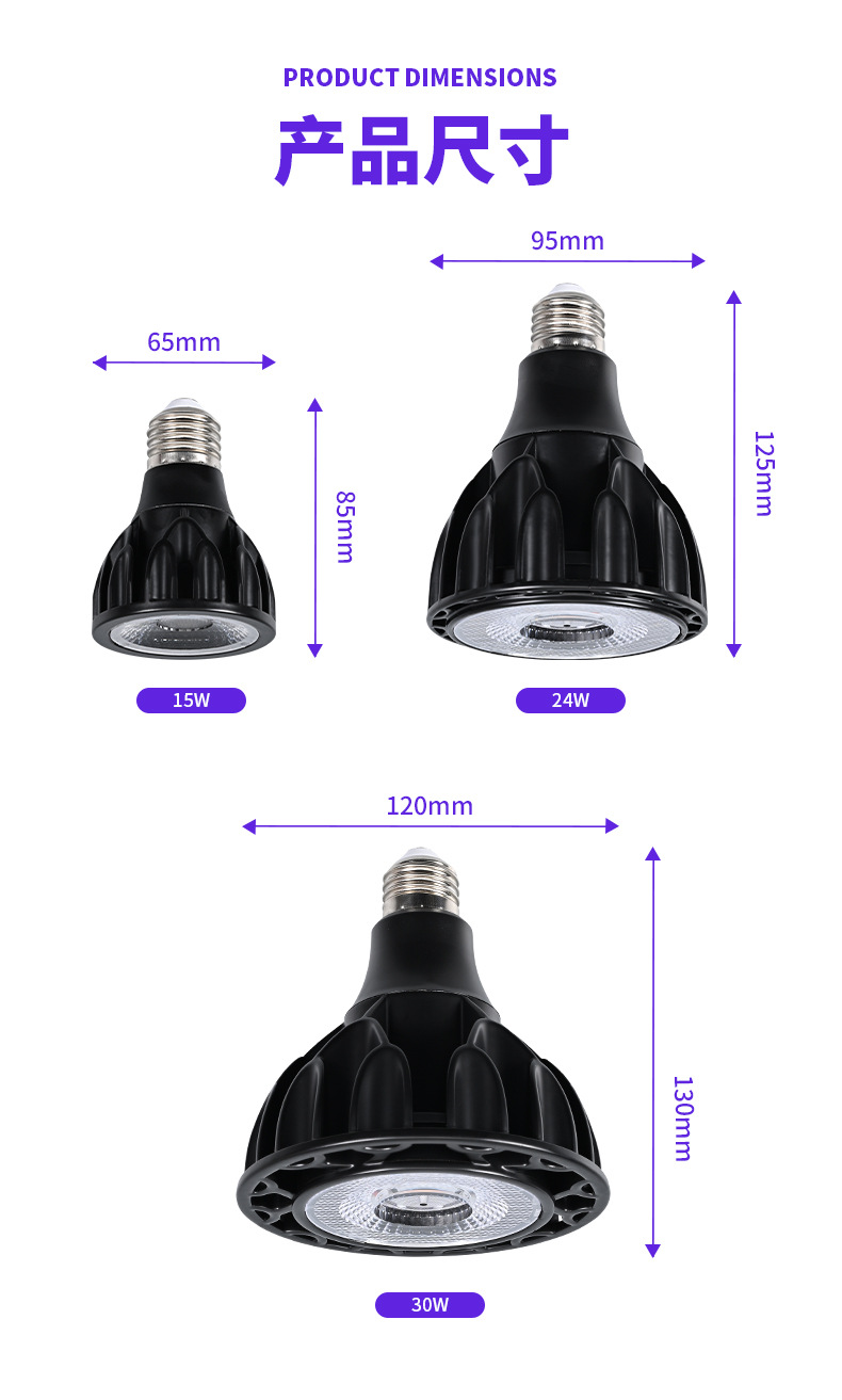 PAR30,尺寸:Φ95 x 125mm,功率:24W,重量0.4kg;