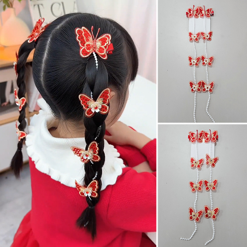 2025蛇年新春の女の子の気質の髪飾り新年の新年のお祝いの大きい赤い仙気の蝶の真珠の鎖は髪を編みます。