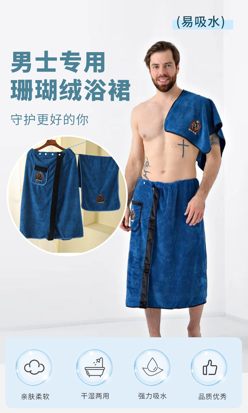 男士浴巾珊瑚绒浴袍易吸水可穿浴巾裹全身可穿刺绣浴裙家用大人