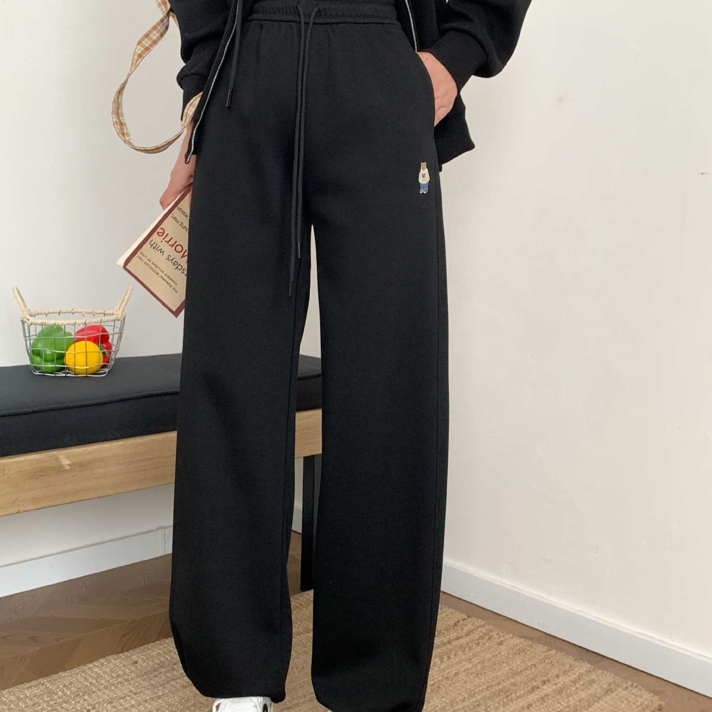加绒阔腿香蕉裤卫裤女束脚裤高腰宽松小熊刺绣休闲直筒运动裤长裤