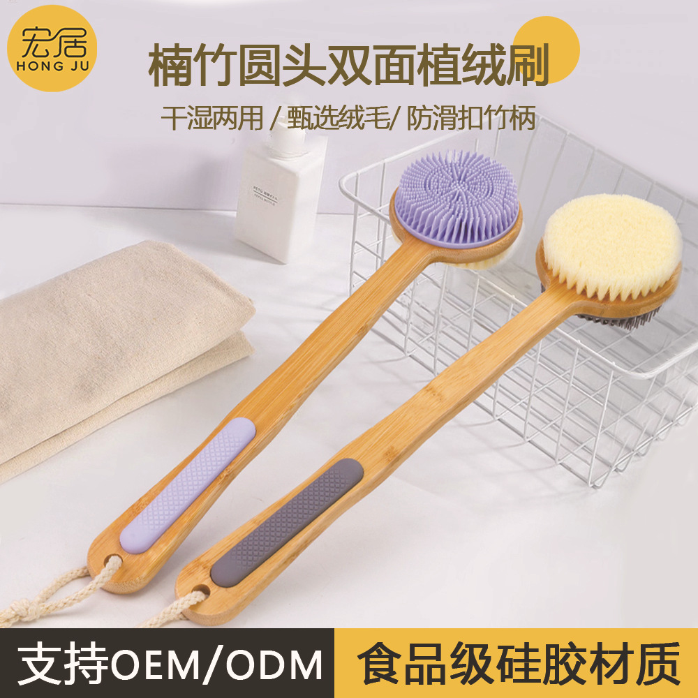楠竹长手柄双面硅胶洗澡刷柔软触感搓澡刷背部清洁去污植绒刷