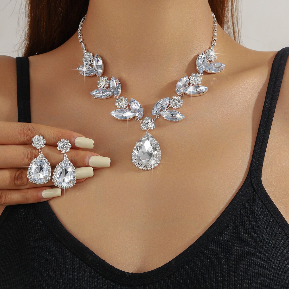 欧美跨境夸张时尚新款珠宝首饰水晶宝石水滴项链耳钉戒指项链套装