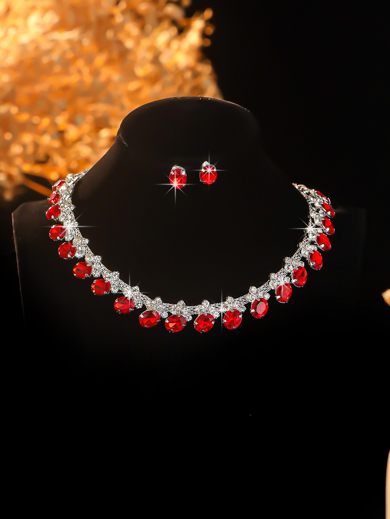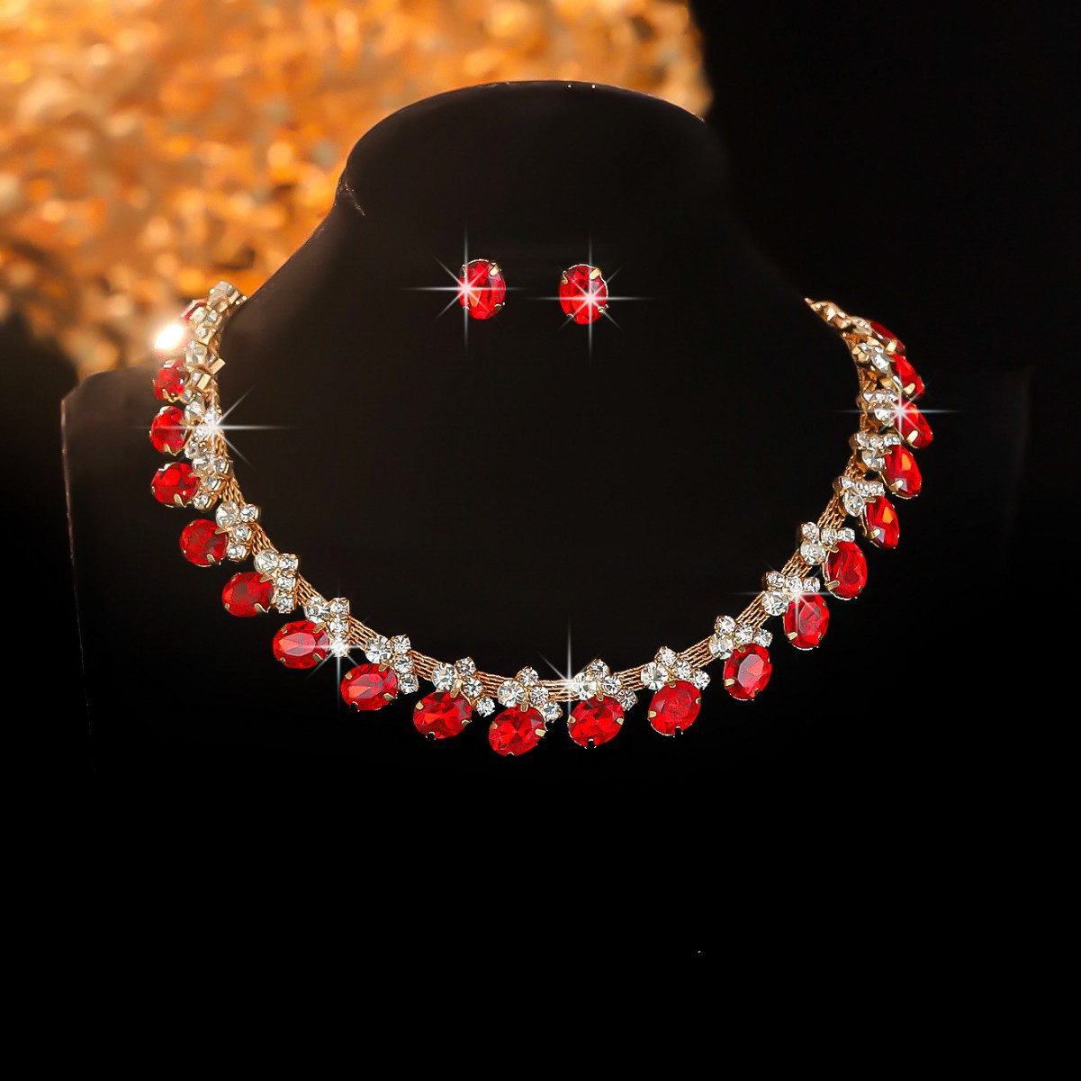 秋冬新款跨境女士时尚彩色水钻镶嵌颈链项链耳钉戒指首饰套装