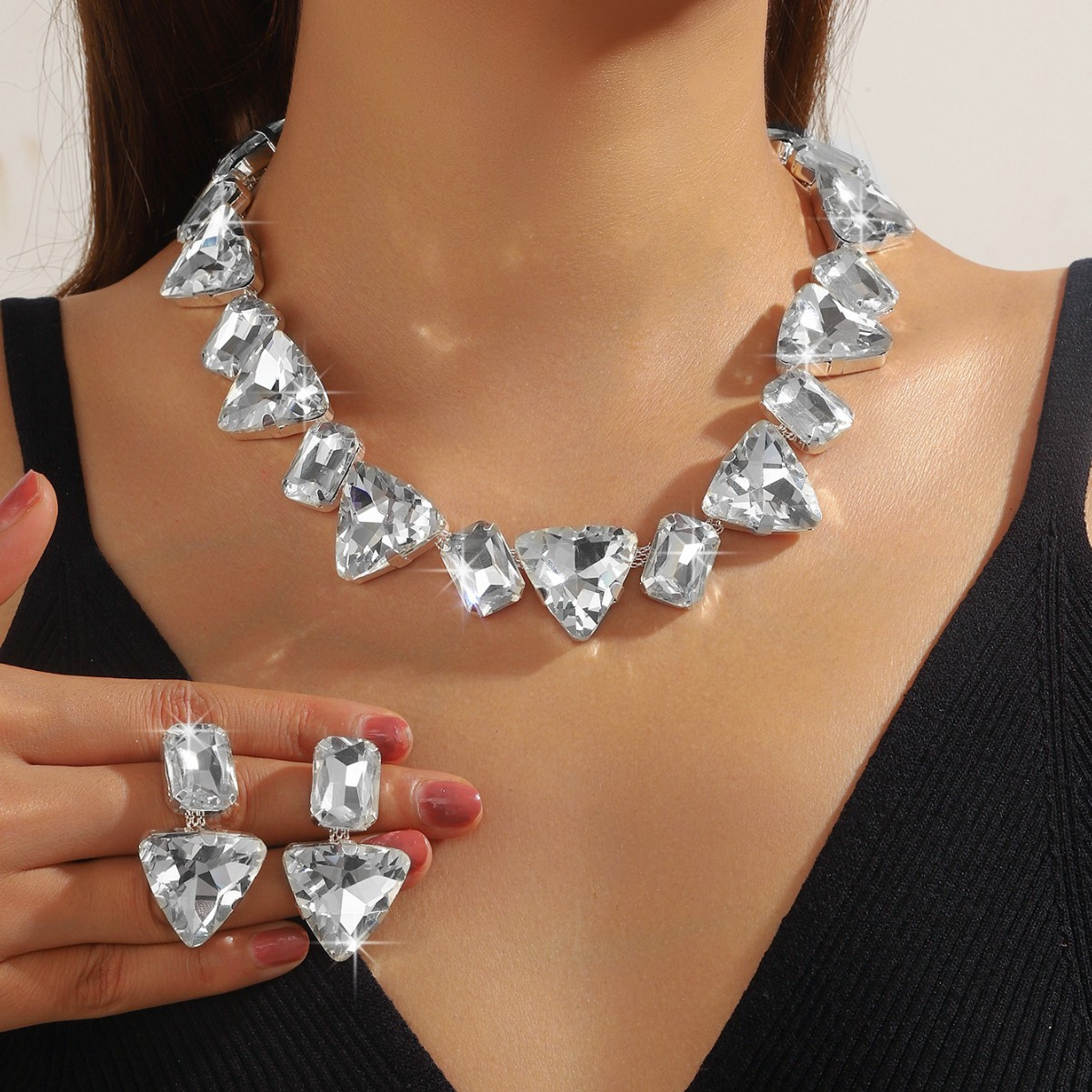 欧美重工跨境新款夸张满钻方块水晶几何耳环颈链套装女时尚个性