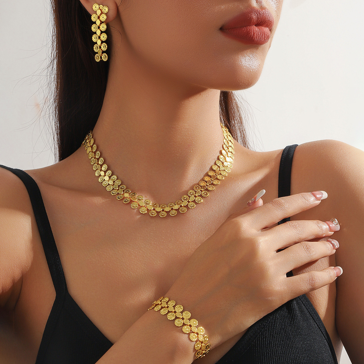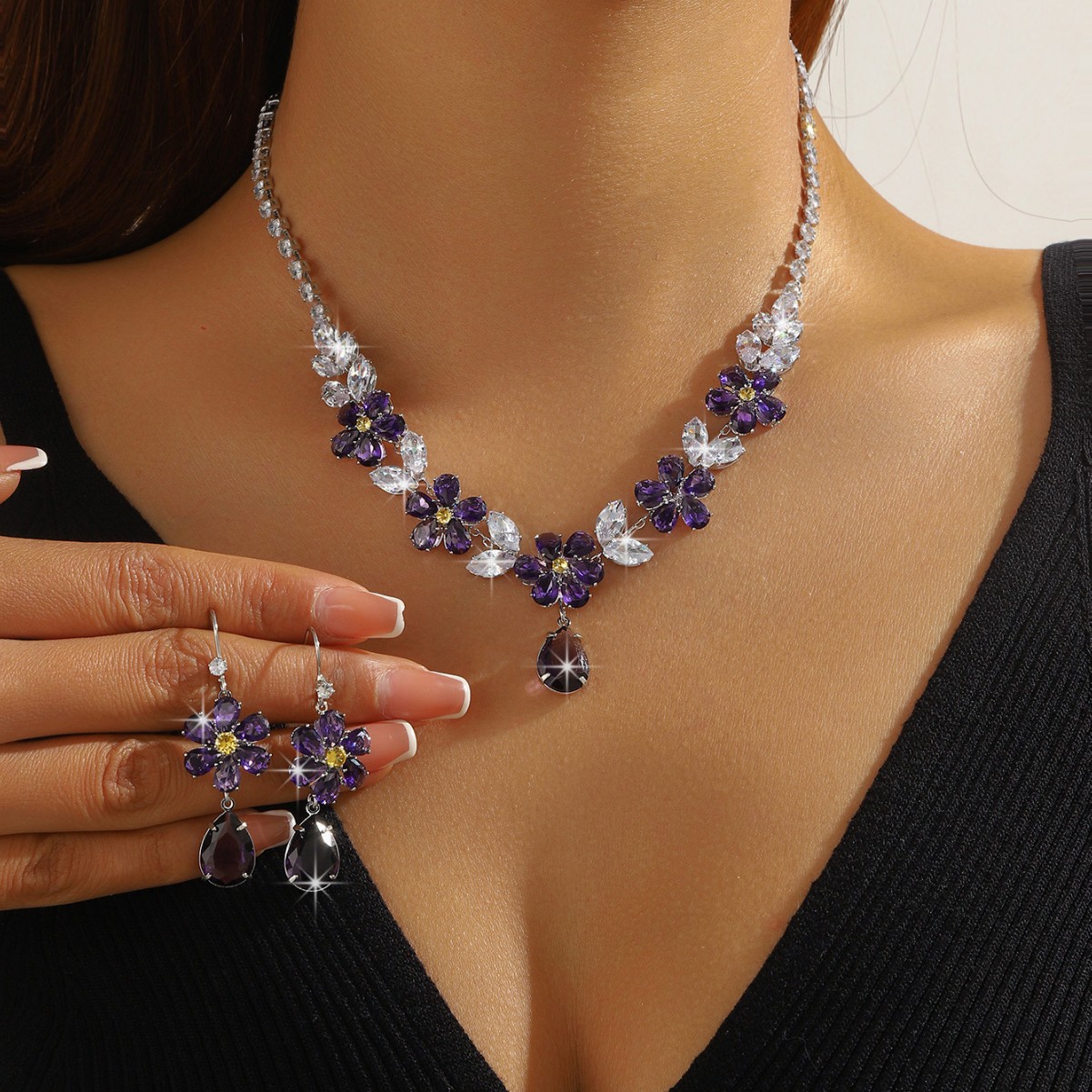 欧美跨境超闪彩色花朵项链耳环套装高级感精致夸张气质高颜值首饰