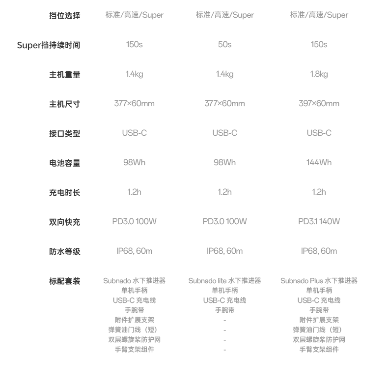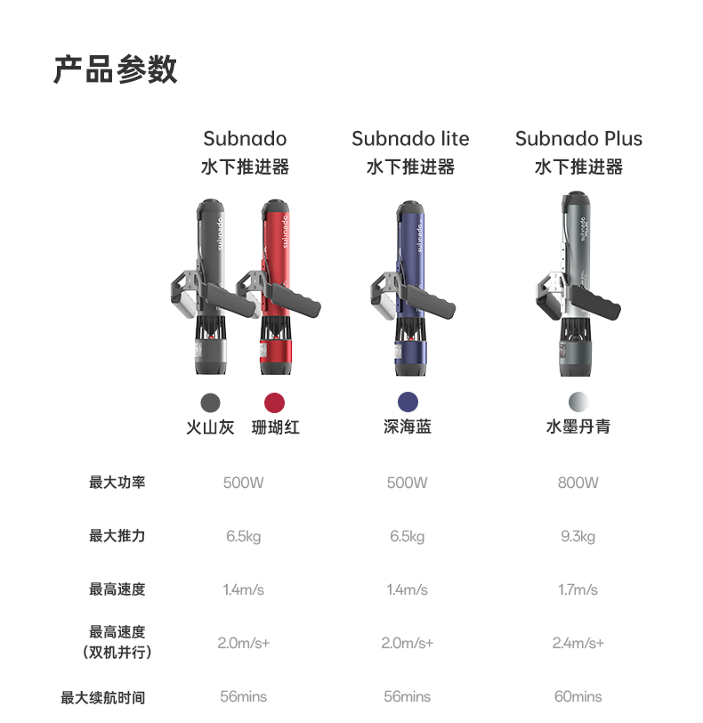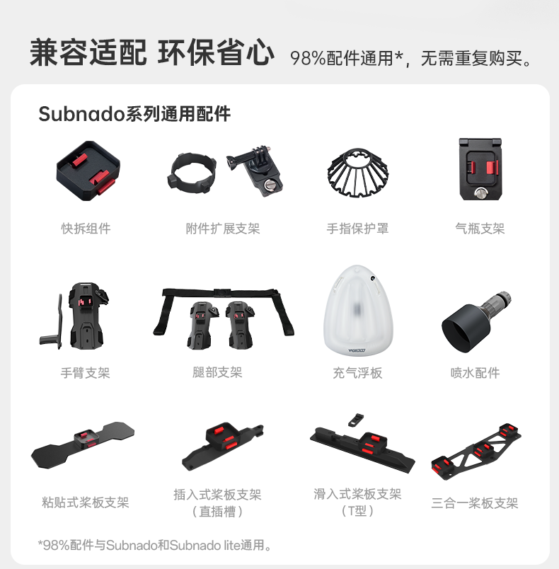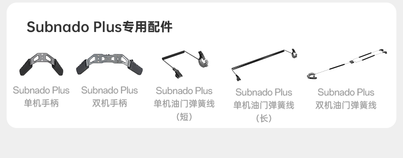 颜色 Subnado附件扩展支架,Subnado plus新品(800W功率大推力),Subnado标配 黑色,Subnado标配 红色 新LOGO,Subnado单主机 无配件 黑色,Subnado双机器套装,Subnado 配件工具包,Subnado桨板套装,Subnado腿部支架,Subnado双握手支架,Subnado滑入桨板支架,Subnado插入式桨板支架,Subnado手臂支架(套餐有标配),Subnado潜水气瓶夹组件(快拆型),Subnado螺旋桨-66mm,Subnado双机线控,Subnado弹簧油门线(短),Subnado弹簧油门线(长),Subnado喷水配件,Subnado绿色浮板,Subnado蓝色浮力仓,Subnado单手柄支架,Subnado快拆组件(含上下盖),Subnado潜水气瓶夹组件,Subnado插入式桨板支架(直插槽)