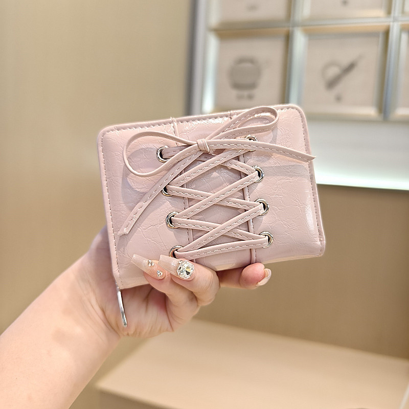 韩版新款简约百搭蝴蝶结绑带拉链搭扣两折小巧精致学生短款钱包女