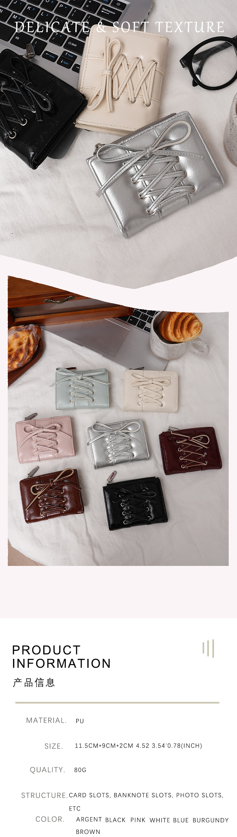跨境新款两折拉链搭扣短款女士钱包简约纯色系绑带蝴蝶结wallet
