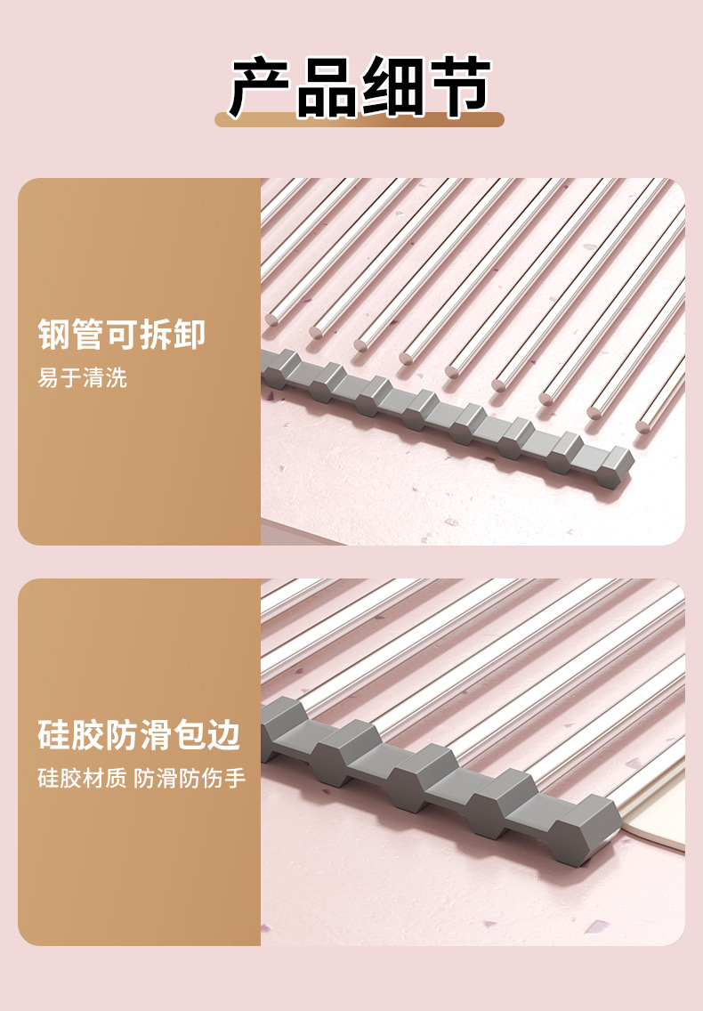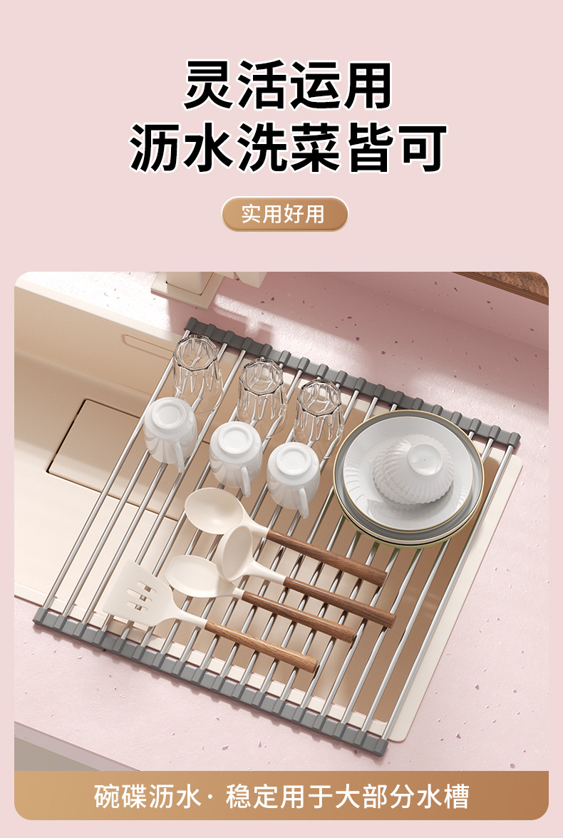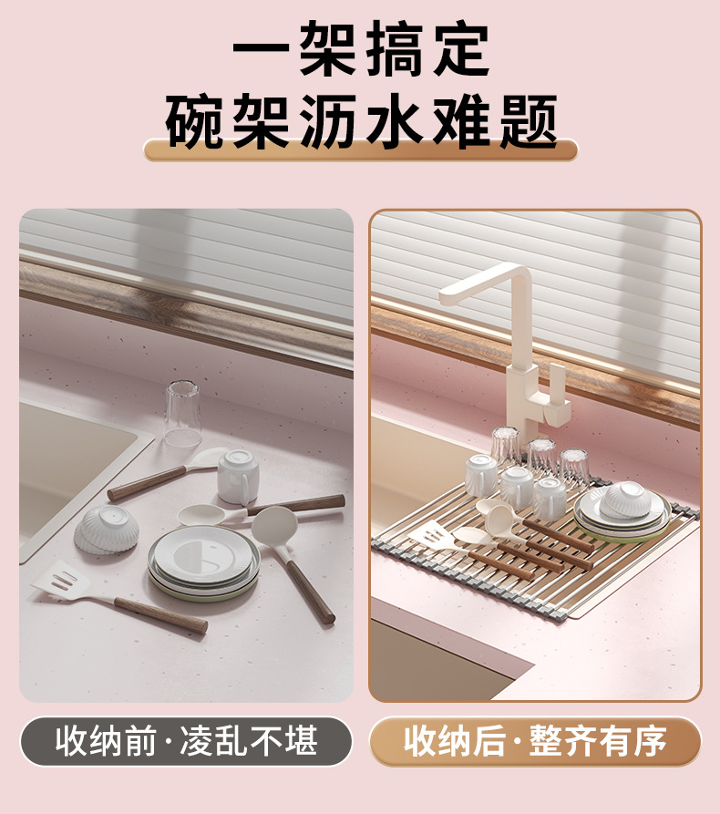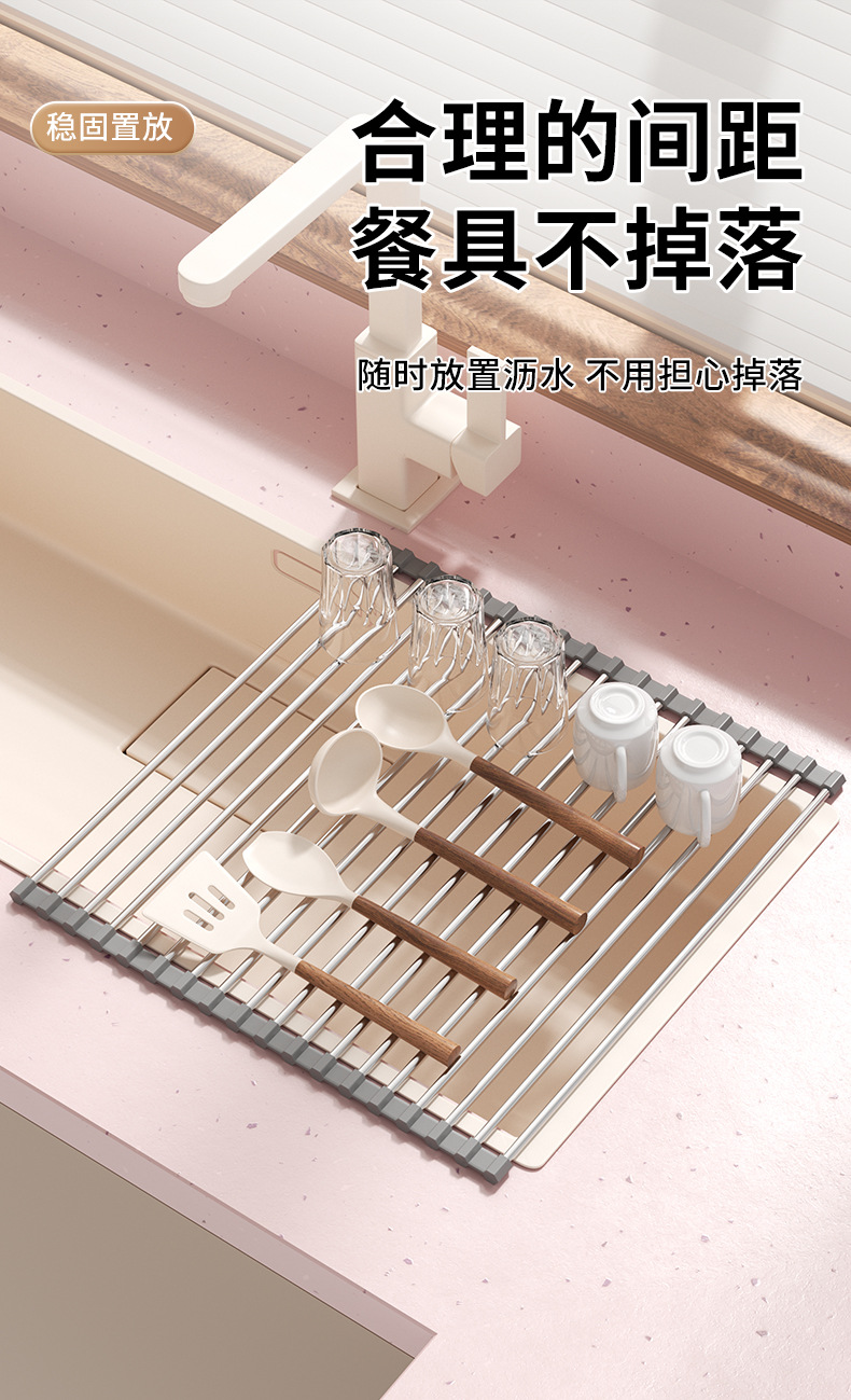 可折叠厨房水槽沥水置物架不锈钢收纳卷帘硅胶洗碗盆池置物碗筷架