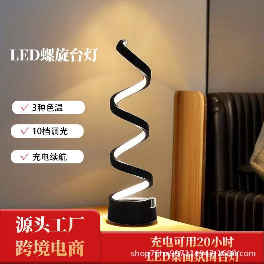 国境を越えたクリエイティブなスパイラルテーブルランプ、寝室用シンプルなベッドサイドランプ、調整可能なLED、USB給電、調光可能、国境を越えて人気商品