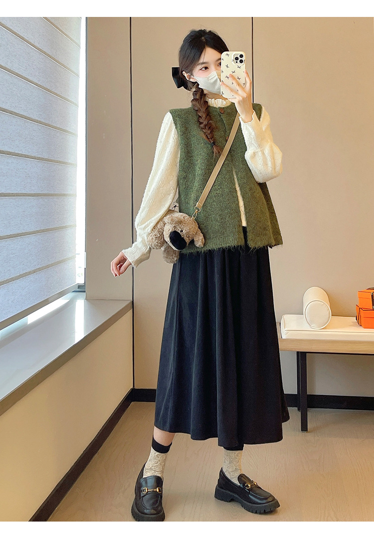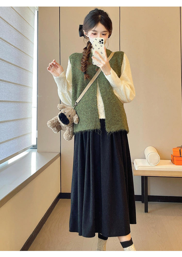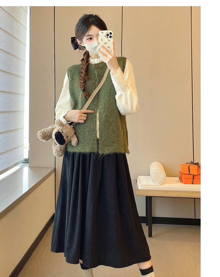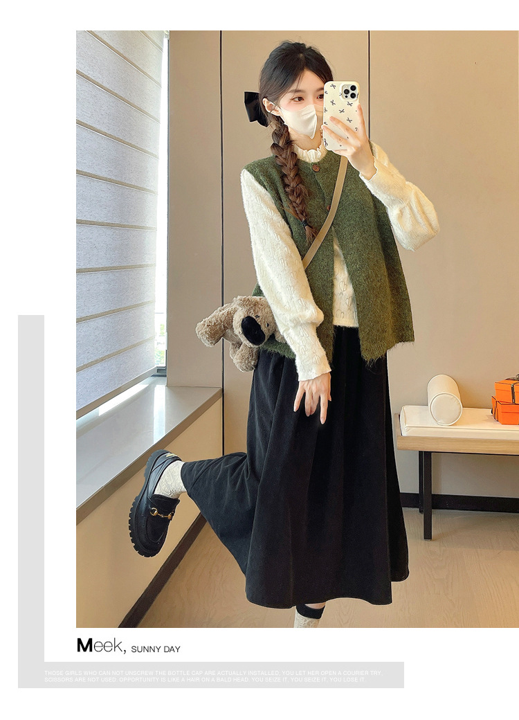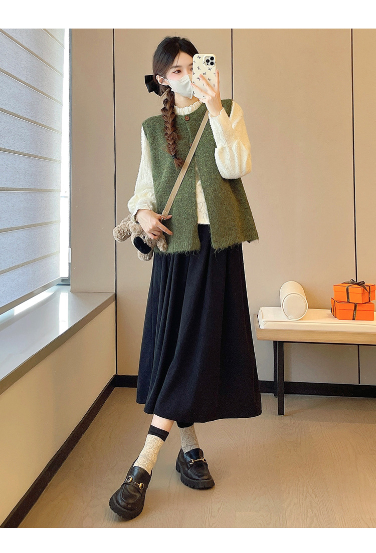 颜色 杏色打底衫,绿色马甲,黑色半身裙,三件套