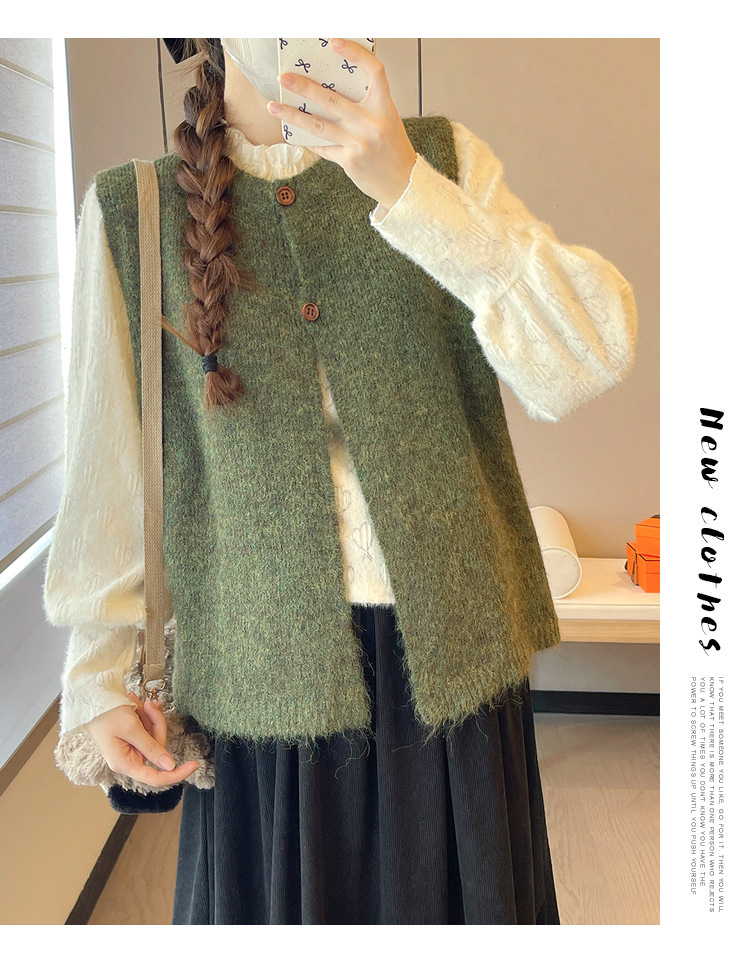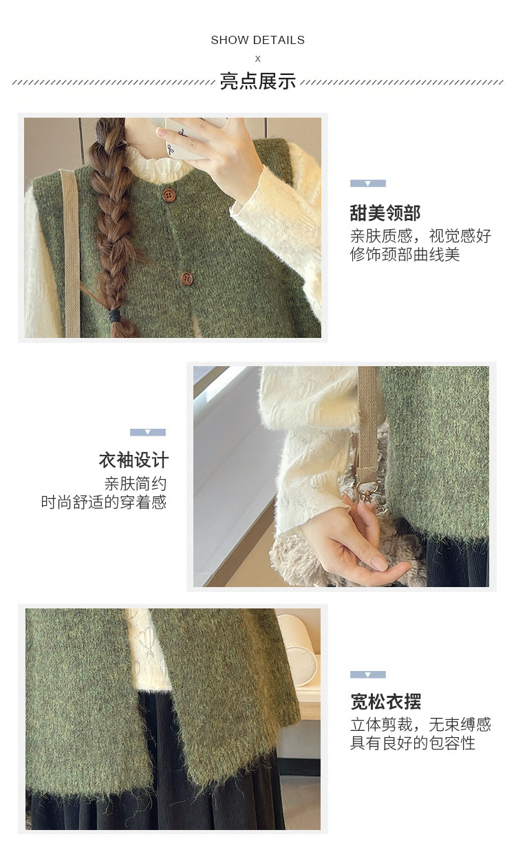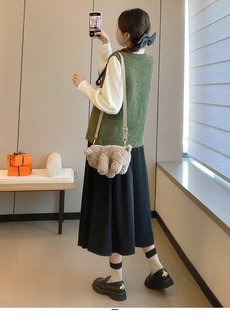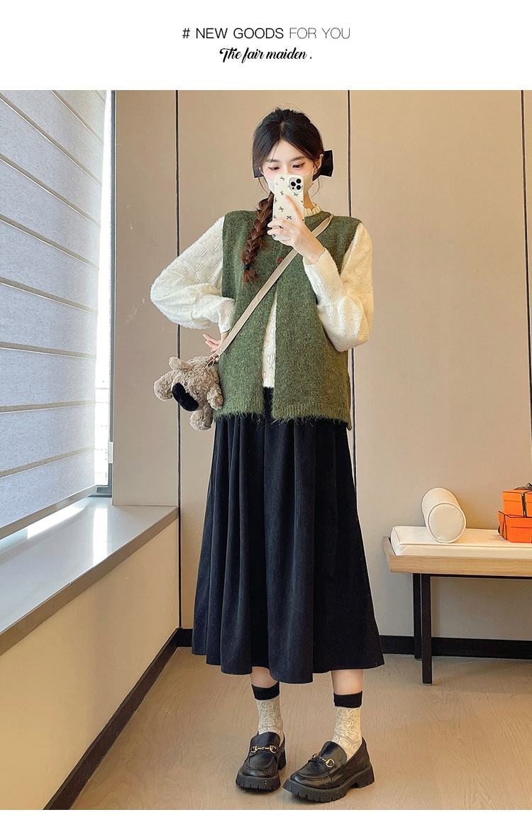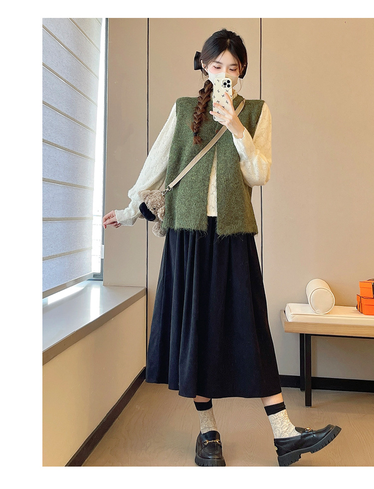 颜色 杏色打底衫,绿色马甲,黑色半身裙,三件套