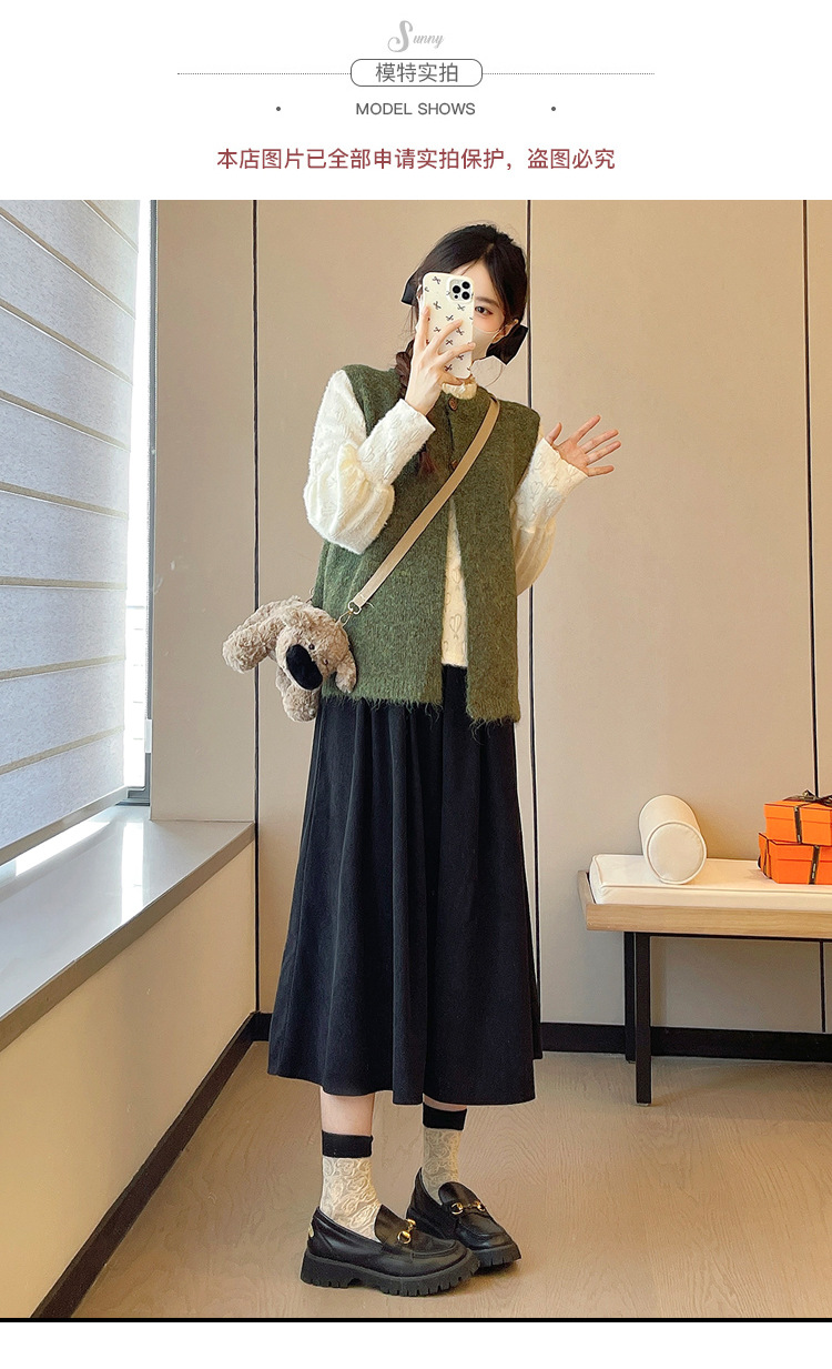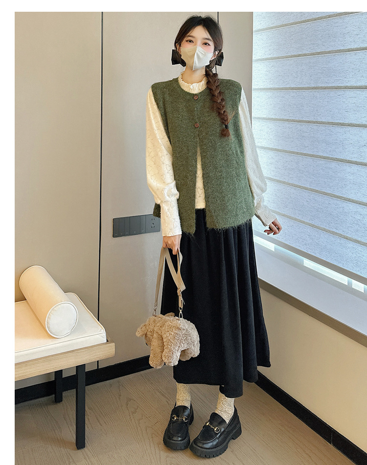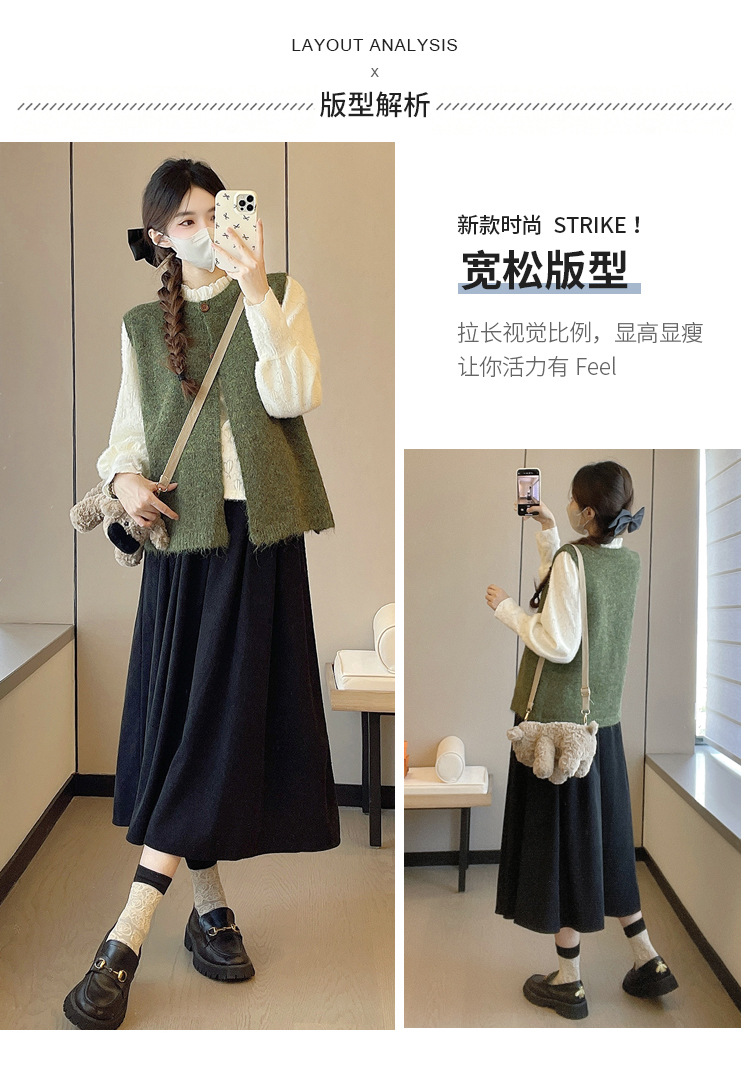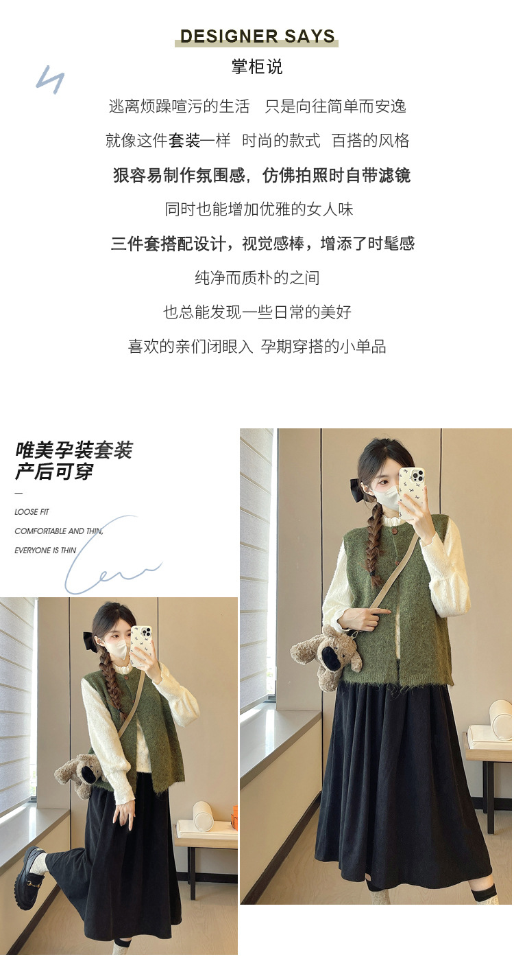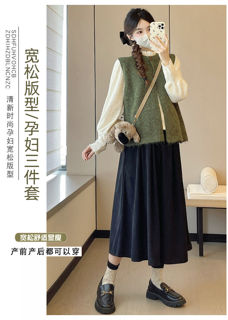 实拍 秋季显白毛衣马甲+打底衫+抽绳半身裙法式孕妈三件套装