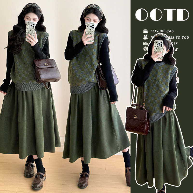 实拍新款 秋冬加厚棋盘格马甲+韩版遮肉半身裙孕妇显白三件套