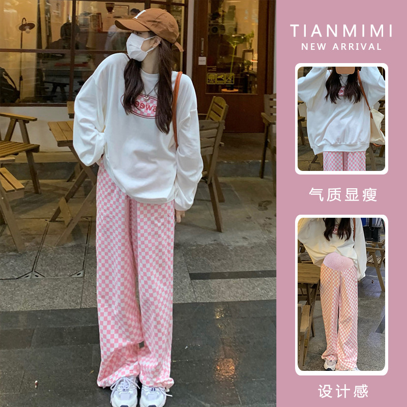 現物の春の薄いプリントの衛衣のピンクのチェス盤の格の腹のズボンのスーツ