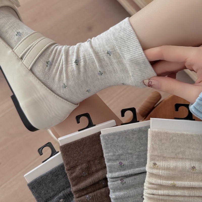 无骨小碎花纯棉中筒袜子女秋冬季日系灰色堆堆袜休闲百搭ins风潮