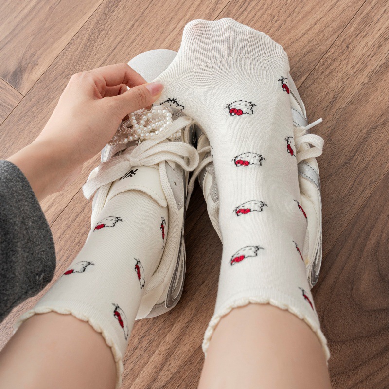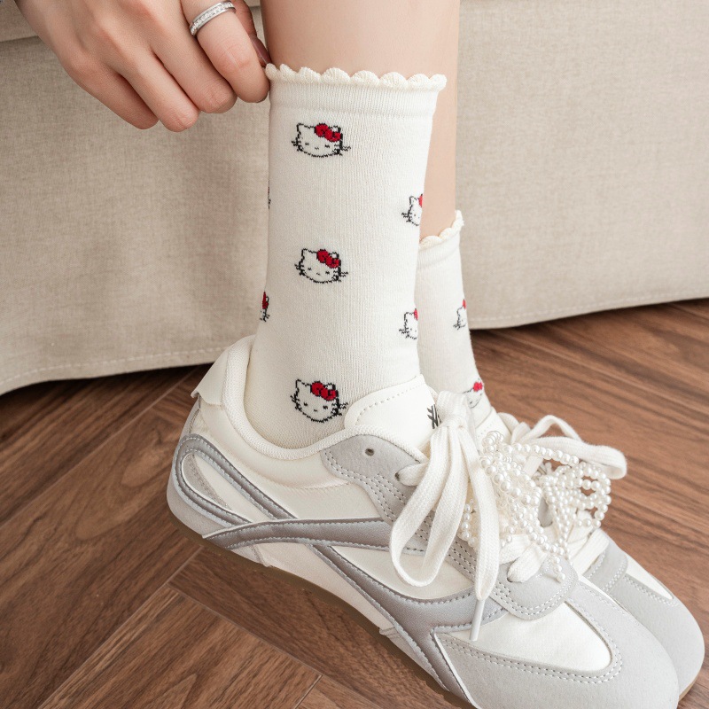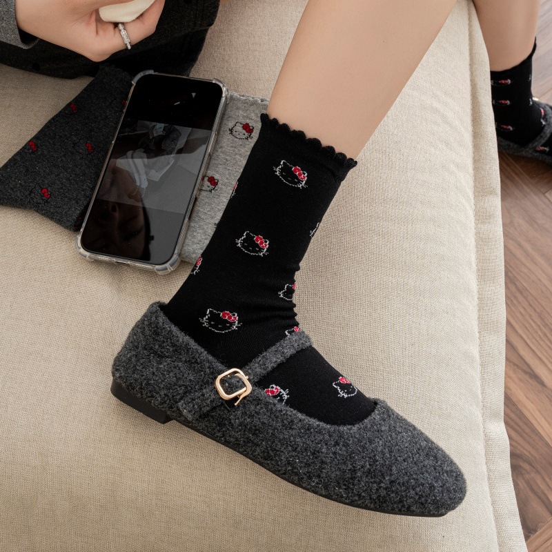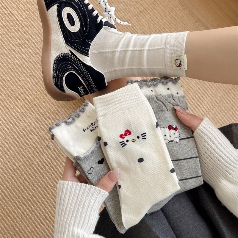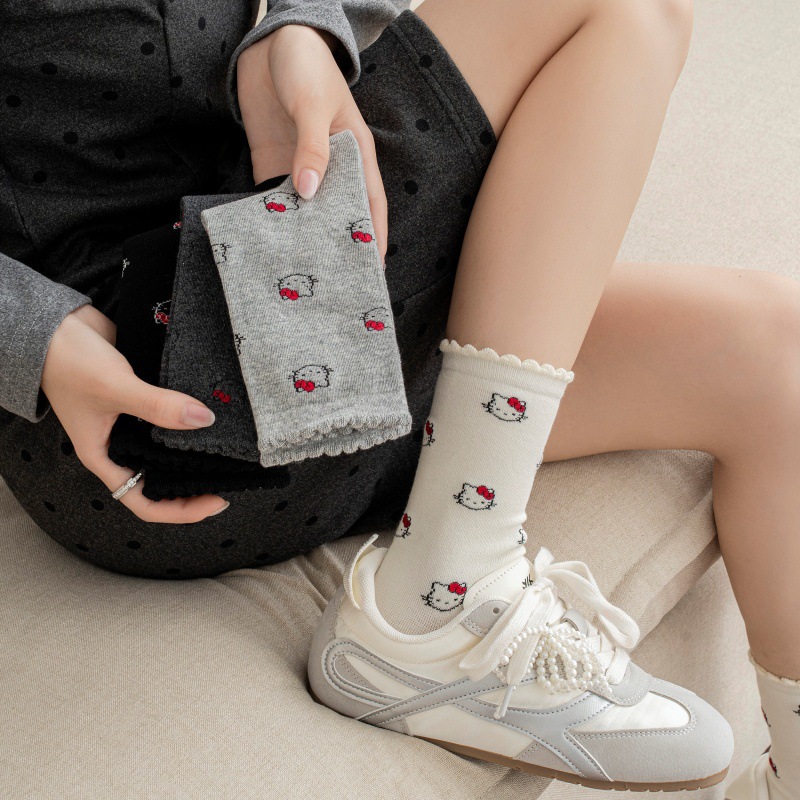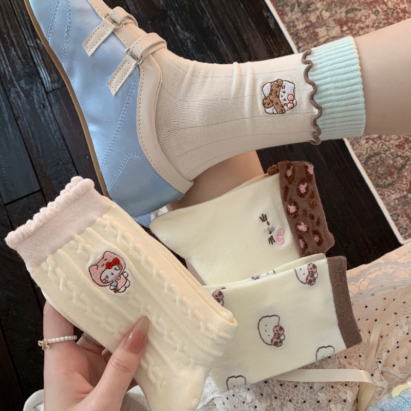无骨kt猫袜子女日系可爱刺绣卡通秋冬款学院风中筒袜木耳花边长袜