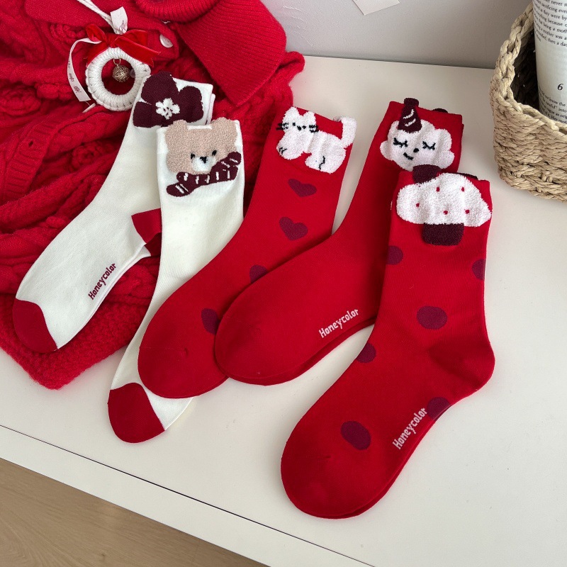 本命年大红色中筒袜子女2025秋冬季可爱猫咪毛绒绒百搭喜庆新年袜