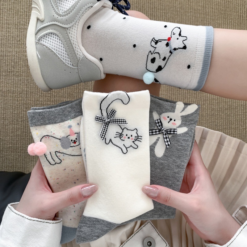 春と夏の薄い骨なし綿の靴下女性のための漫画動物立体弓飾りミッドカーフソックスカレッジスタイルパイルソックス