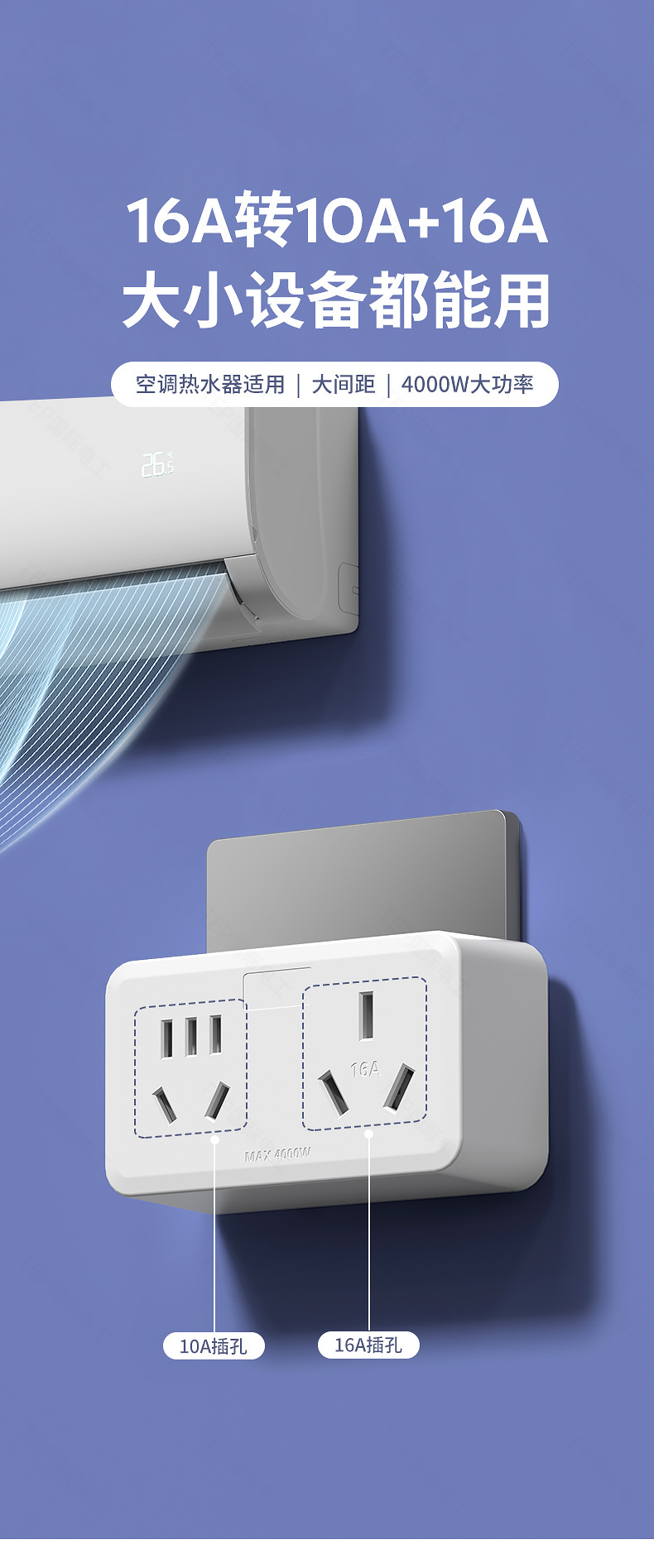 空调16a插座一转二16a转10a热水器转换头16安转换器三孔无线扩展