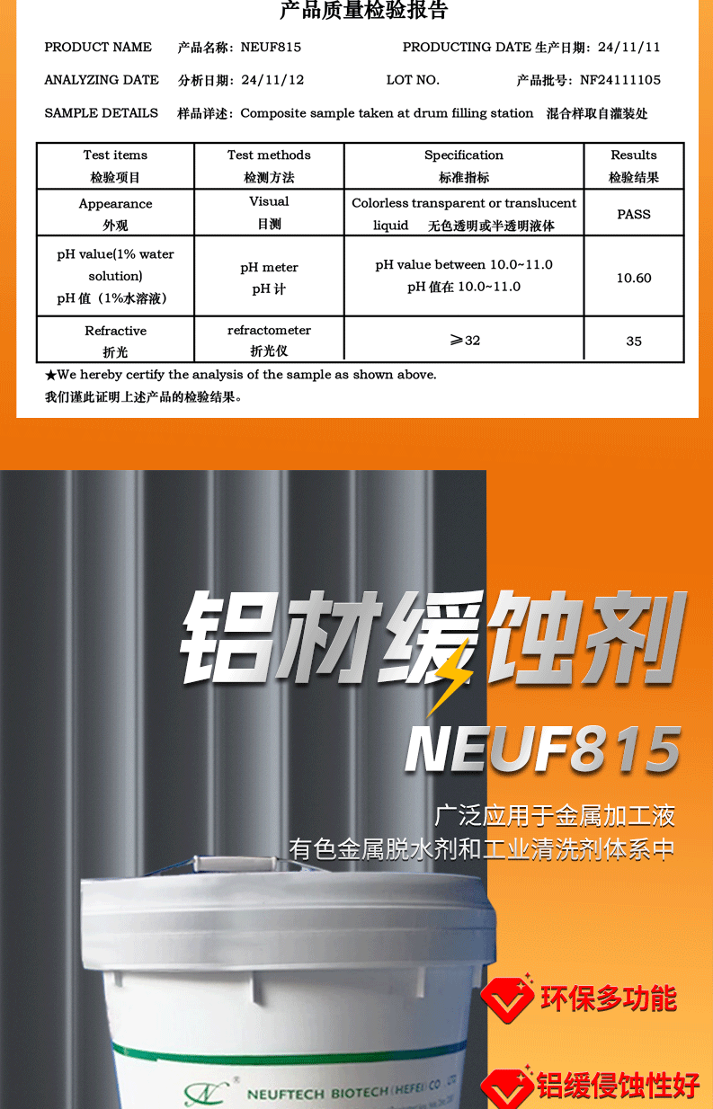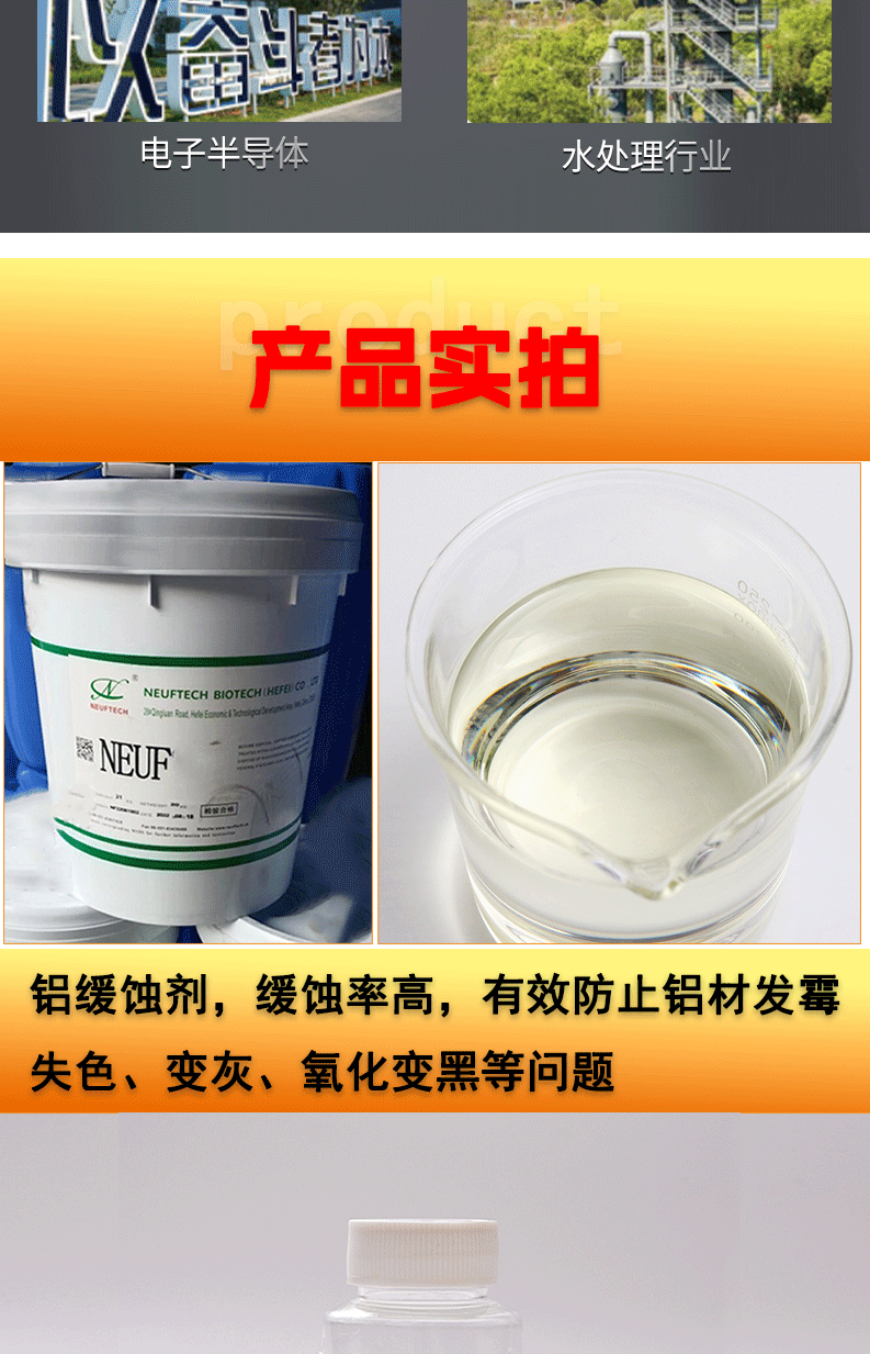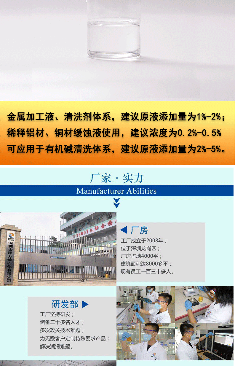 2、适用于铝材、铝合金的金属加工液、切削液、乳化液、清洗液、防冻液、冷却液、液压支架液、接触性工作介质的缓蚀剂