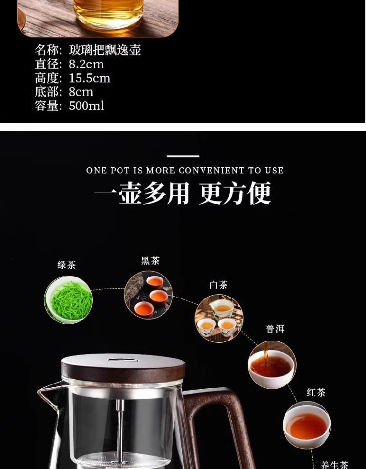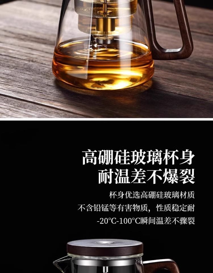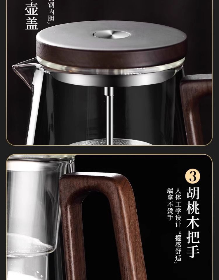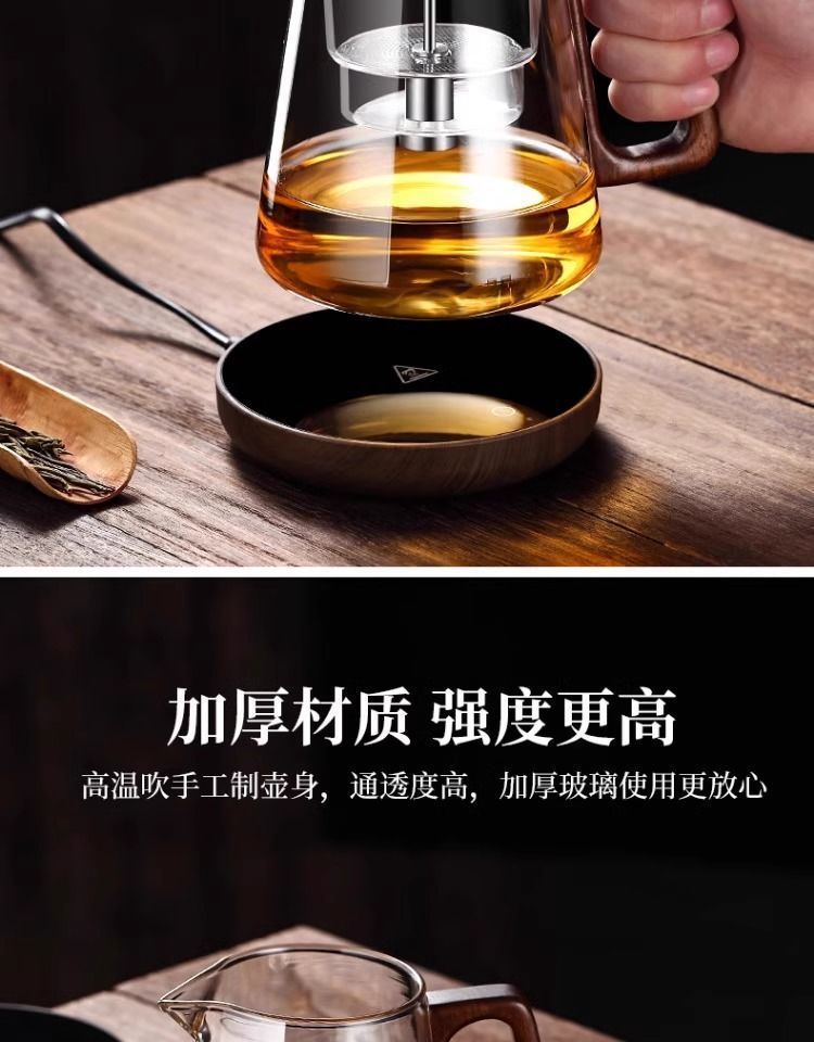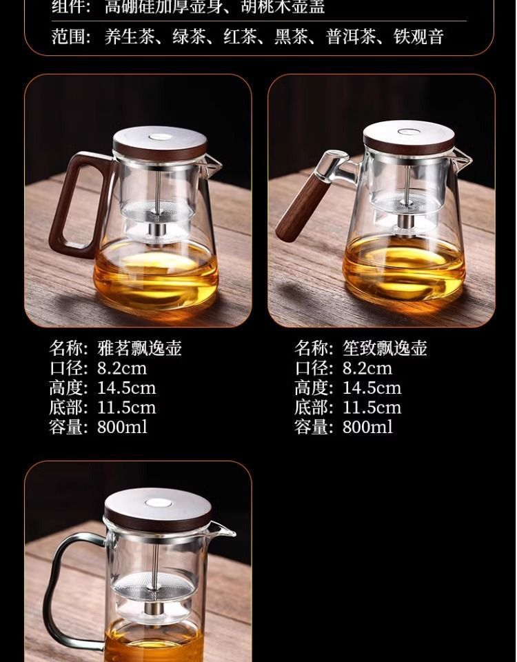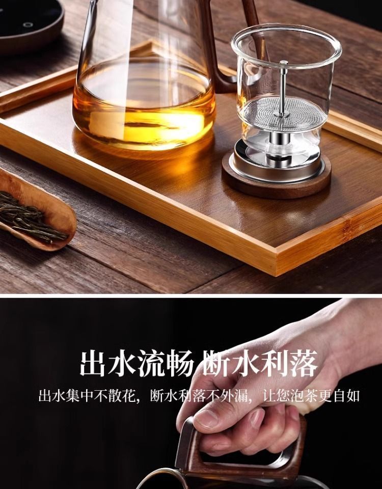 ふわふわカップティーポット胡桃木取っ手ガラス内胆一ボタン濾過茶水分離押圧式ティーポット