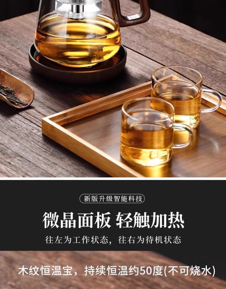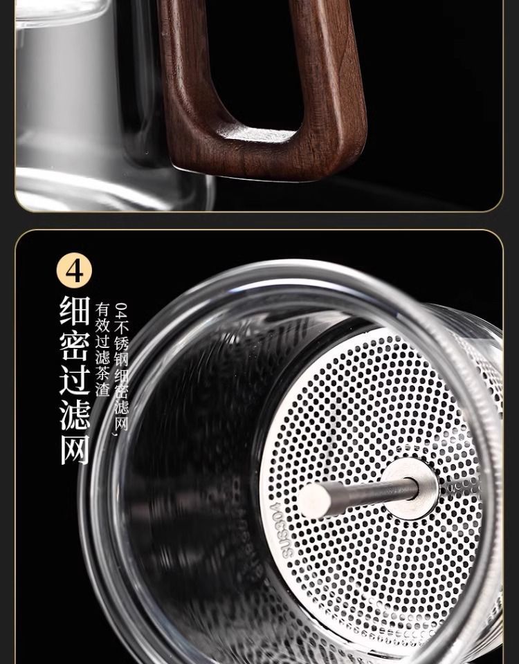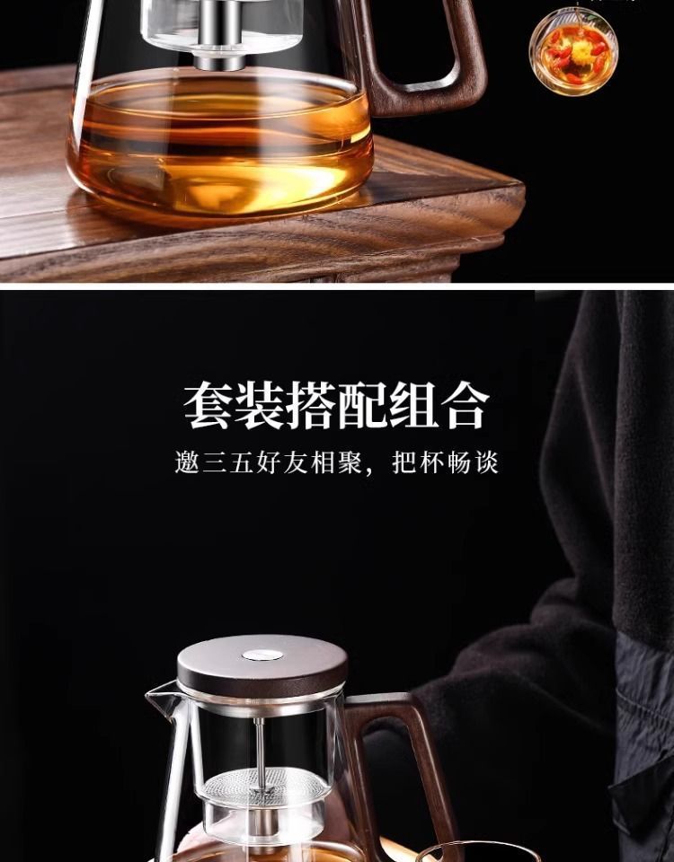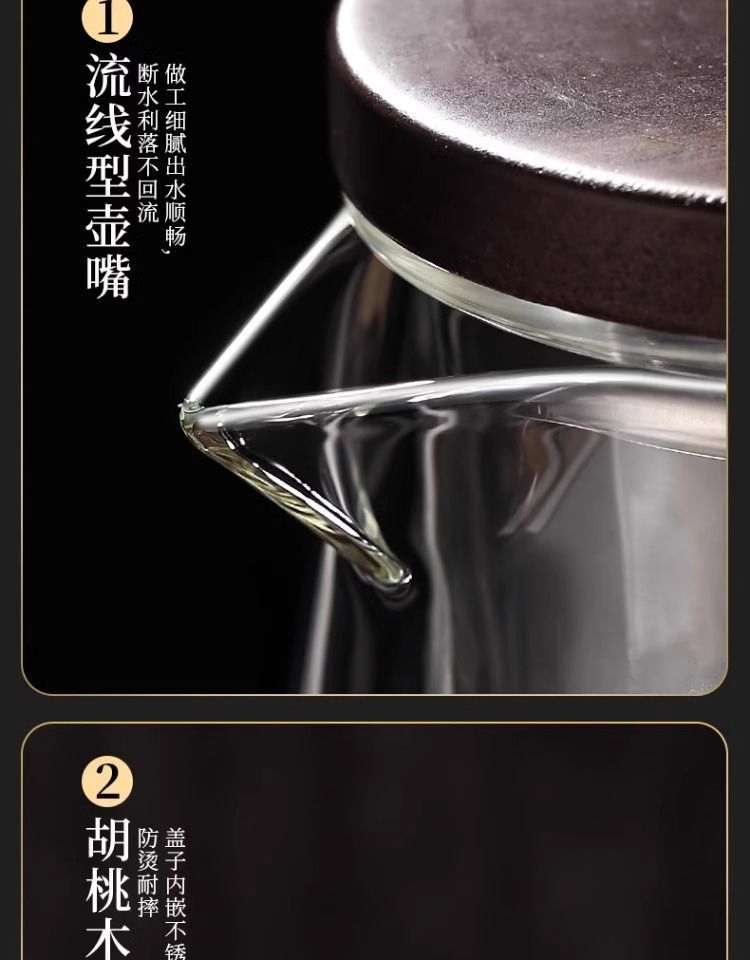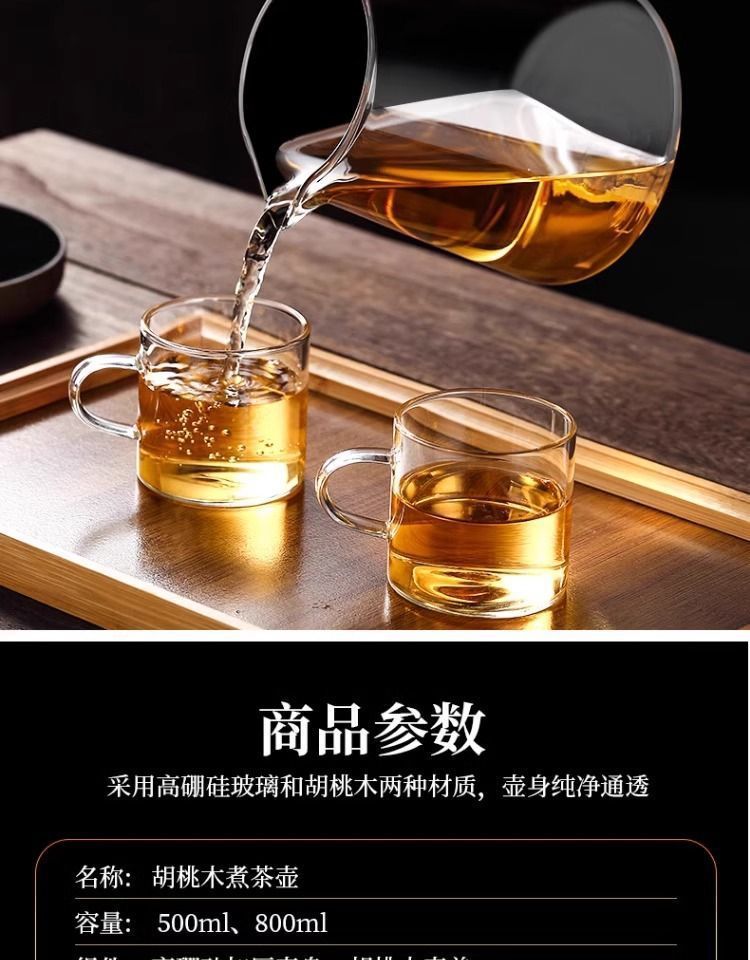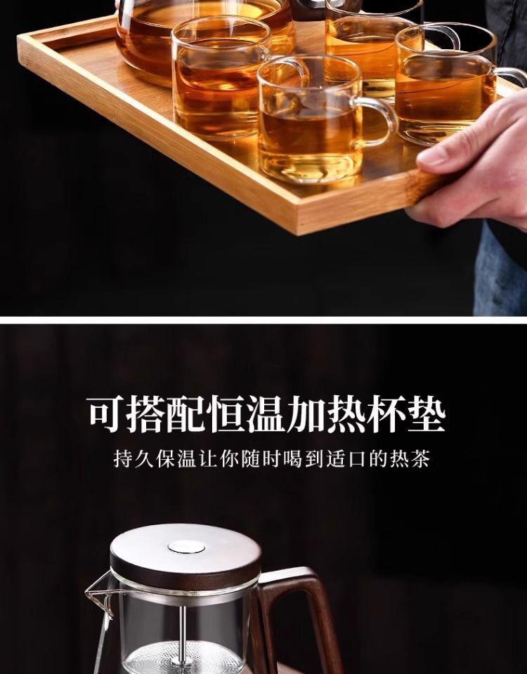 ふわふわカップティーポット胡桃木取っ手ガラス内胆一ボタン濾過茶水分離押圧式ティーポット