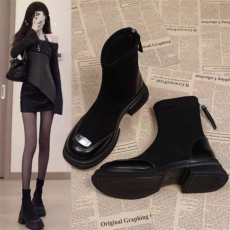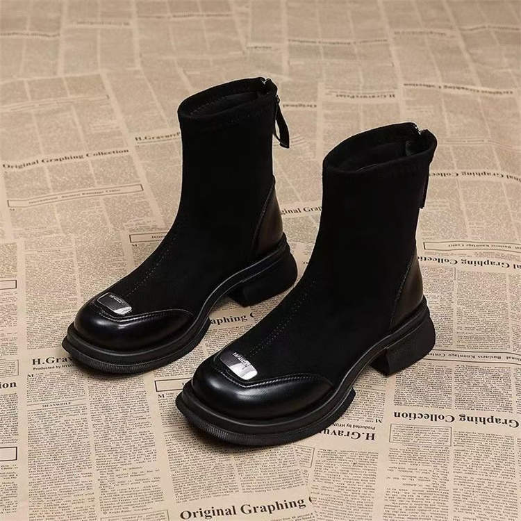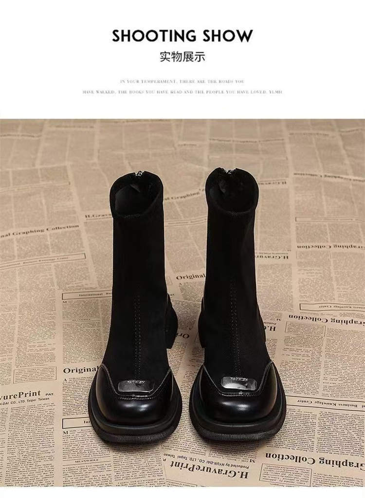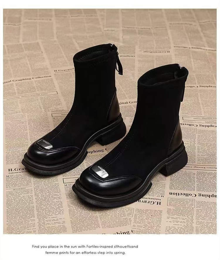 针织弹力瘦瘦靴女粗跟2025秋冬新款乐福鞋短靴马丁靴中跟复古袜靴