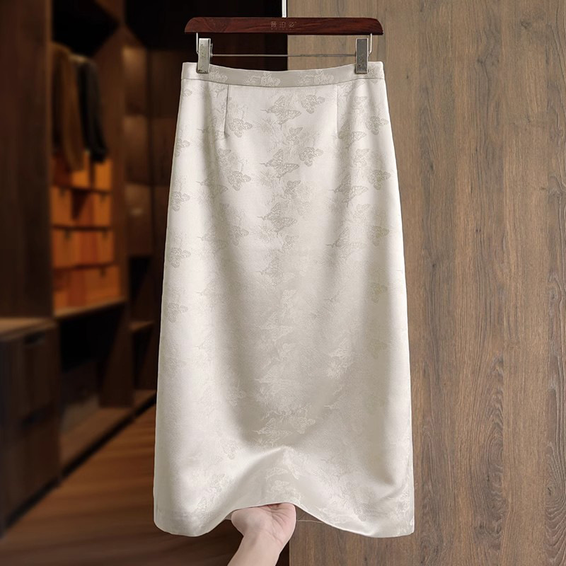 醋酸缎面半身裙女夏季新中式国风提花裙子复古开叉中长款直筒半裙