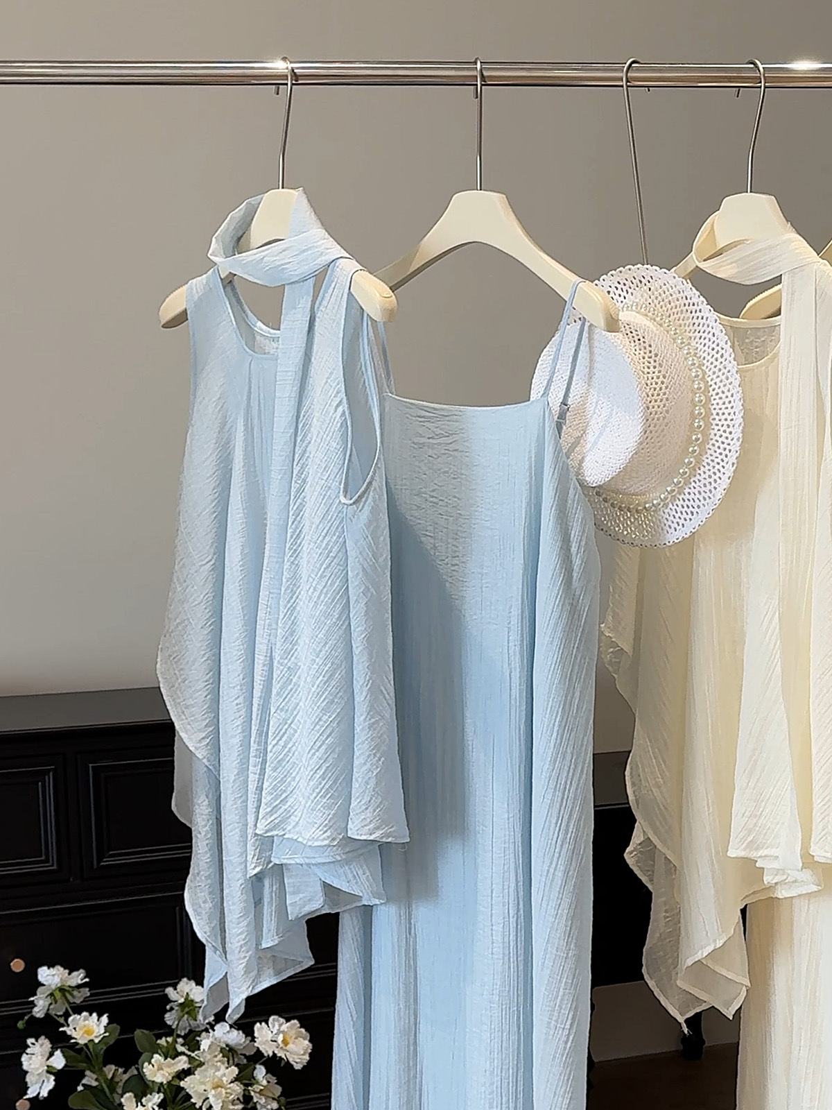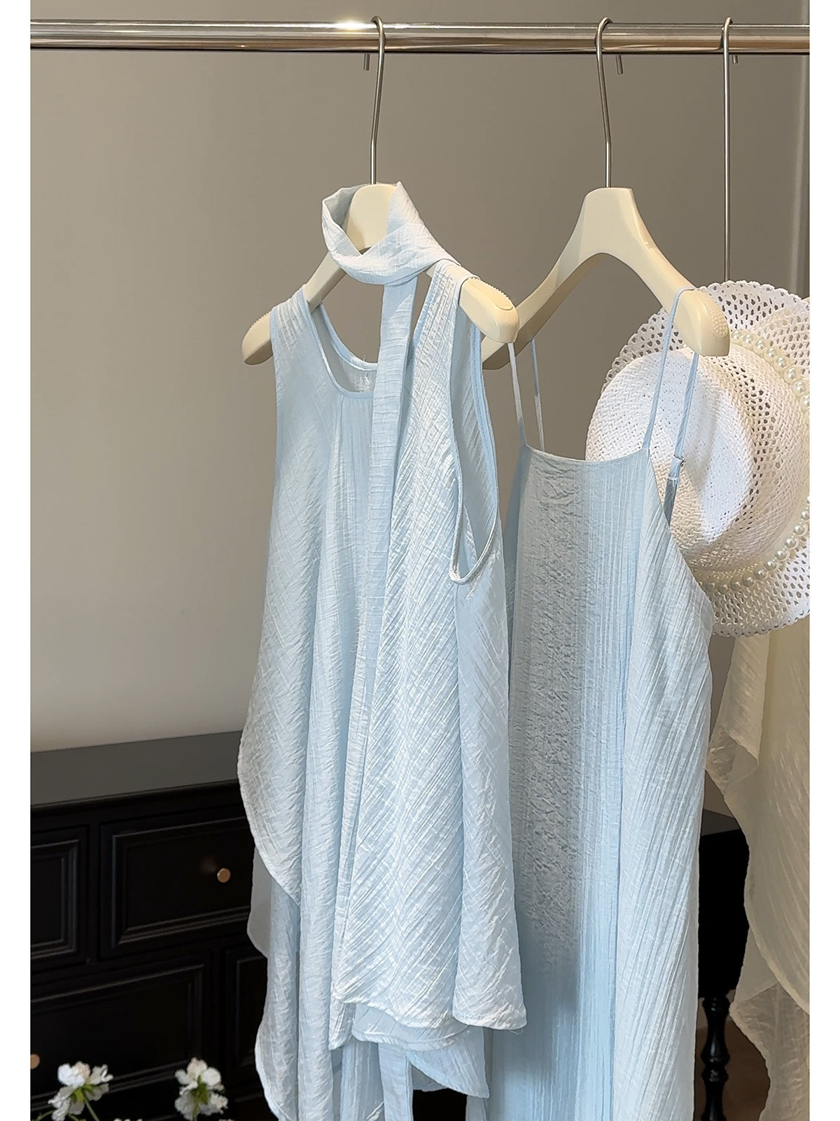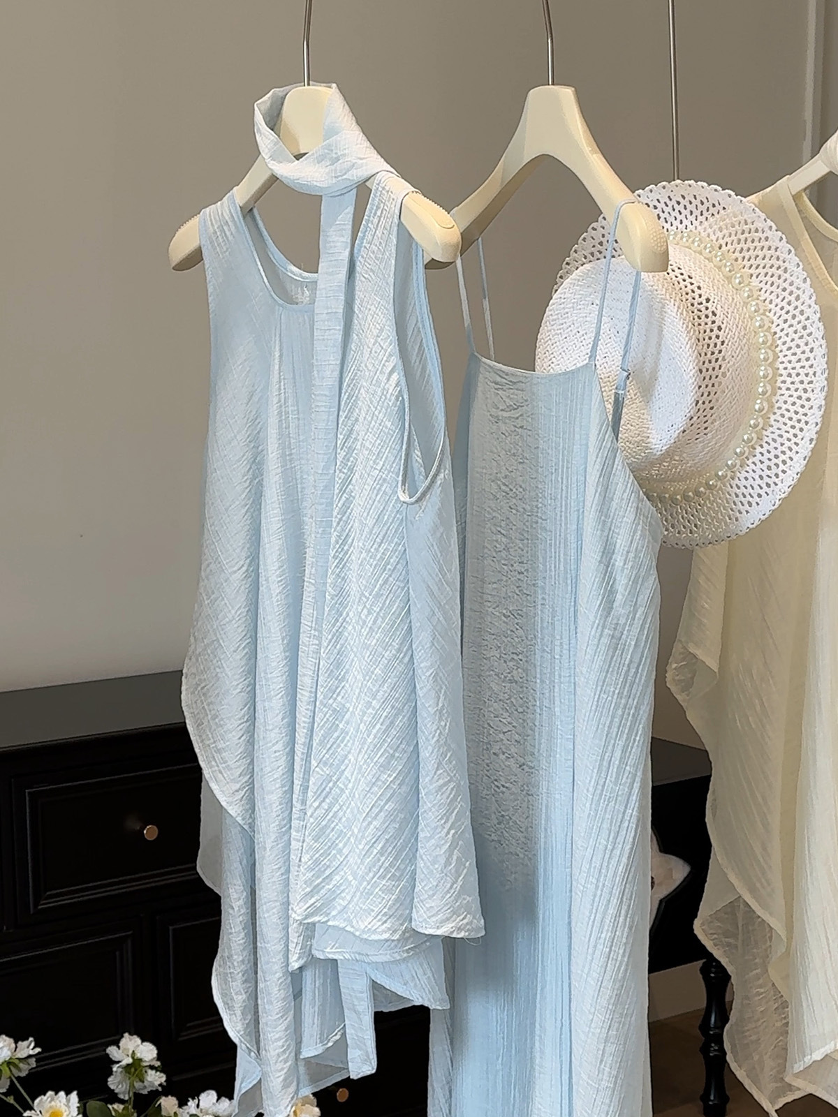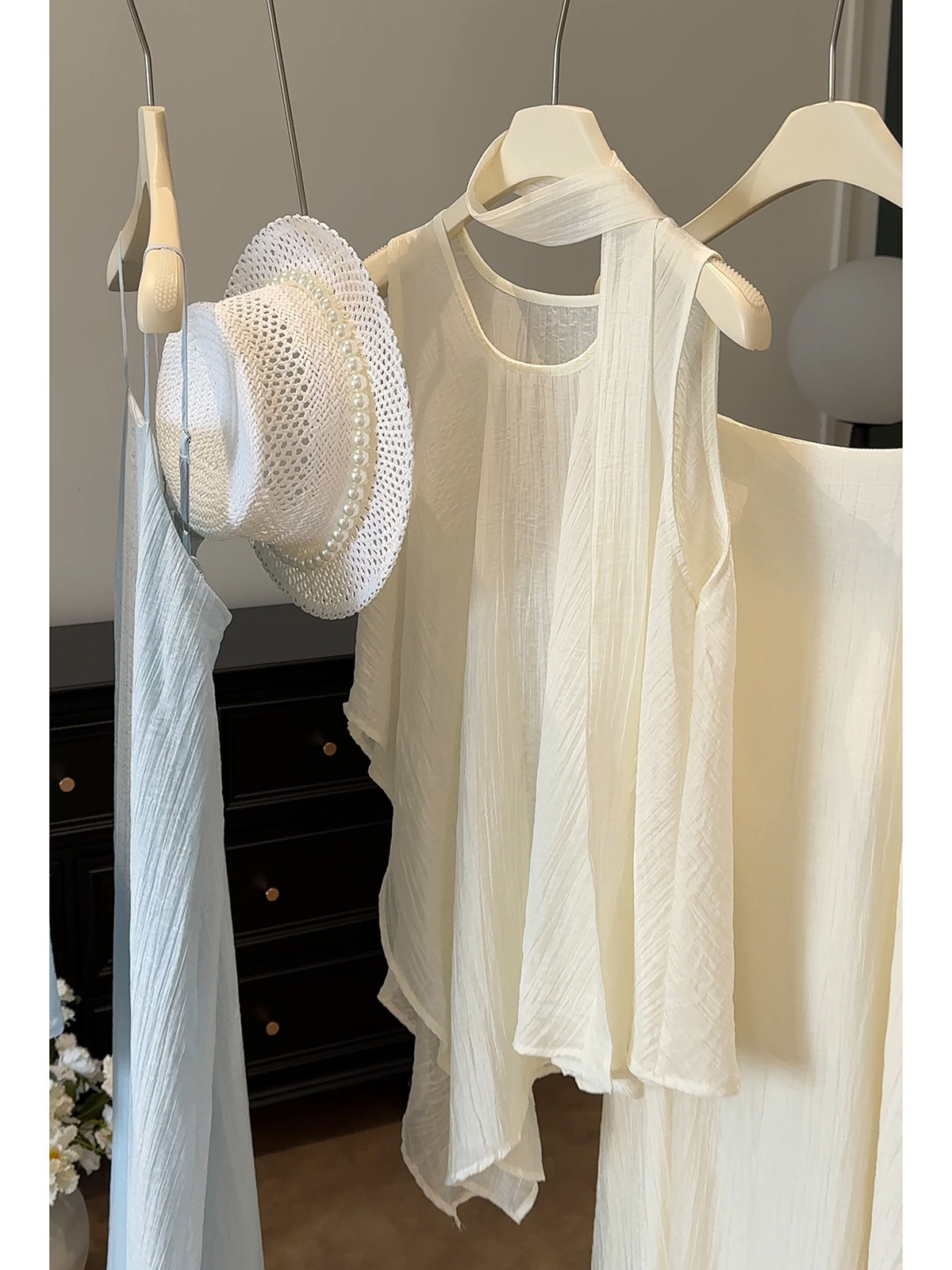 绝美漂亮海边度假风薄纱不规则背心+大摆吊带裙连衣裙飘带三件套